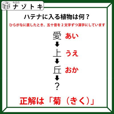 そうです!これは五十音表の順番通りに2文字ずつ分けて漢字に直したものです。つまり、現在は「丘」の「か」までいってますから次の2文字が答えとなります。正解は「菊(きく)」でした。