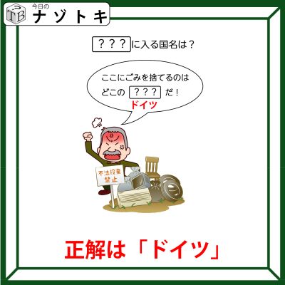 そうです!「ドイツ」です。ドイツがはいると「ここにごみを捨てるのはどこの「ドイツ」だ!」となります。イラストとぴったり合いますね。正解は「ドイツ」でした。