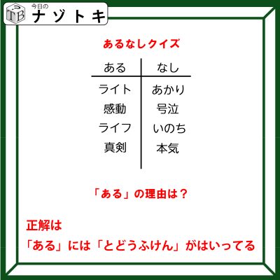 あるなしクイズです!「ライト・感動・ライフ・真剣にある」って、何がある?順番も大事です【難易度LV4.・辛口】