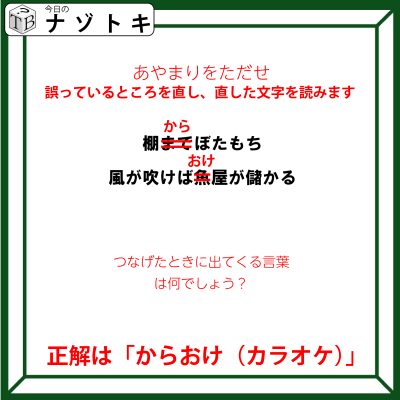 すると上から「棚からぼたもち」「風が吹けば桶屋(おけや)が儲かる」となります。もっと細かくいうのであれば上は「まで→から」「魚→桶(おけ)」に治っています。