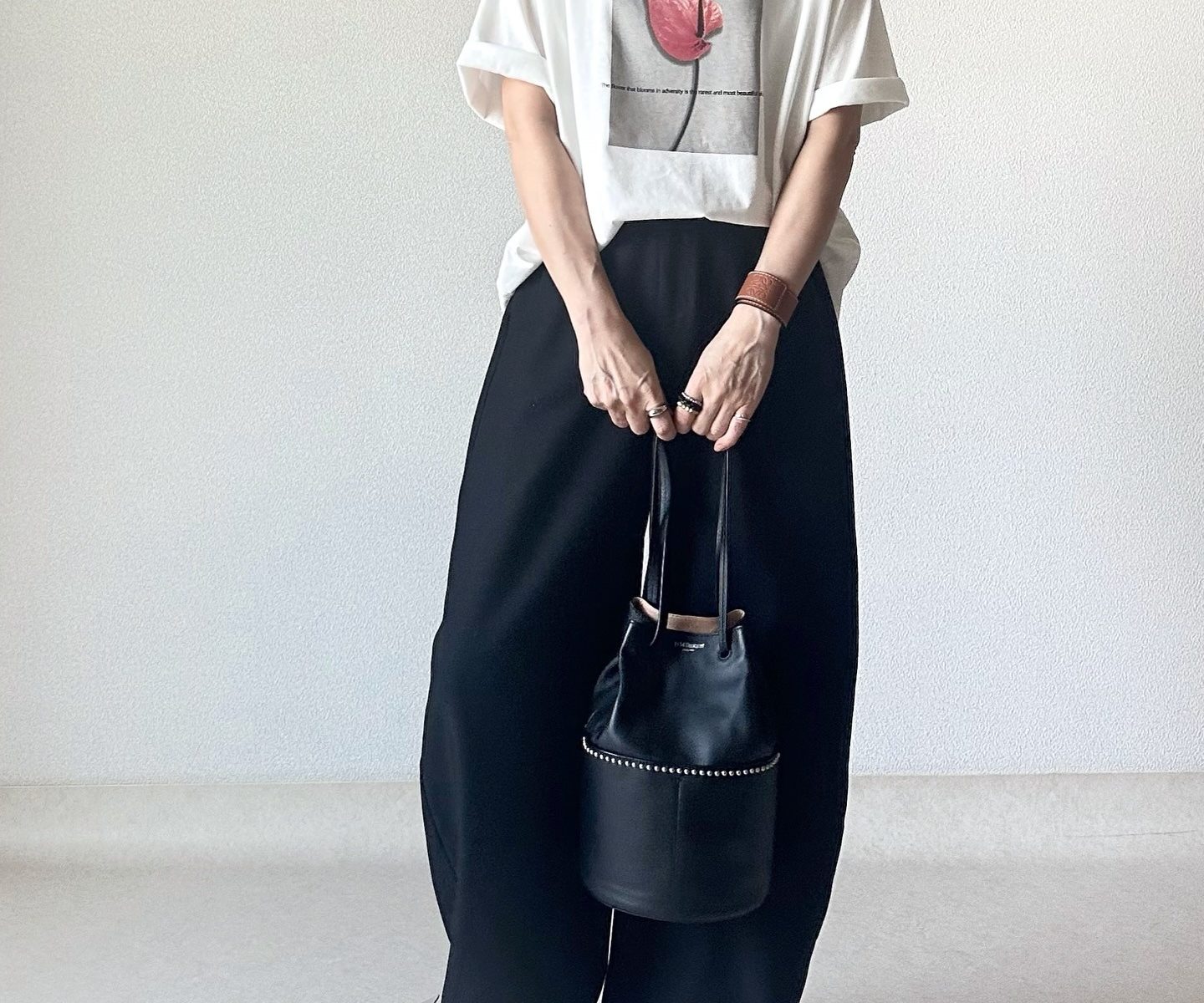 ゆったりとしたシルエットのフォトTシャツは、ほどよい抜け感を演出してくれるアイテム。落ち感のあるワイドパンツと合わせることで、リラックスしながらもきちんと感をキープ。足元はシルバーのサンダルでモード感をひとさじプラス。