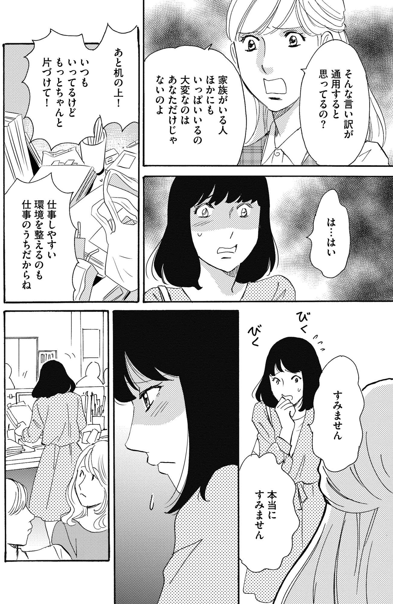 ゴミも捨てない、仕事もできない正社員の尻ぬぐいを私がしなきゃならないの?【自称うつ女、仕事しろ! #4】 2025.08.26 LIFE 自称うつ女、仕事しろ! 試し読みマンガ試し読みマンガ試し読み ▶Renta!『自称うつ女、仕事しろ! ~仮病詐欺の逆パワハラOL~』 ▶30日間無料▶ Amazonの読み放題をチェック! 【99円で2カ月間】 Audible が無制限で聴ける! ▶楽天KOBO 初回購入金額のポイント最大70倍! スポンサーリンク 次のページへ >> 1 2 3 【注目の記事】 「優しかったころの夫に戻って欲しい」その“希望”にすがり続けた妻が、裏切られ、心を壊していくまで 1番対策が難しかった…!頬のたるみやほうれい線につながるNG食事習慣最後のひとつ 冬の寒さに負けない!そろそろ準備したい中綿アウター×【ユニクロ】バズりデニムの着こなし【40代の毎日コーデ】 【ユニクロ】カシミヤタッチニットで魅せる!旬のブラウンを効かせた洗練肩掛けテク【40代の毎日コーデ】 東大生が注意喚起!「鵜呑みにしてはいけない」SNSで「でたらめの受験情報」を発信する人の特徴とは この記事は OTONA SALONE1 スポンサーリンク スポンサーリンク 【人気の関連記事】 40代。もう私、いつ死んだっていい気がするけど | あした死ぬには、#1 突然の病気。更年期障害。取れない疲労、お金の不安、これからの人生の迷い……。40代がぶち当たる「壁」をあまりにもリアルに描き出し、熱く静かな共感をさらった雁須磨子さ… 人前では「完璧な夫婦」を演じる夫。普段は私を無視してるって、誰も知らない【女40代はおそろしい#11】 40歳・フリーデザイナーの丸山ふさ子。 夫との攻防戦の末、「共働きだけど夫のほうが家事育児多め」という関係にやっとたどり着く。バリキャリ会社員のまい、起業家のかお… 年齢、たまに忘れてない?アラフォーあるあるが「共感しかない」と話題 「最近、若い頃と比べて何かが違う……」そんなモヤモヤを抱えているアラフォーのみなさん、必見!イラストレーターのRingoman(@ringo_fashion)さんがインスタグラムに投稿…