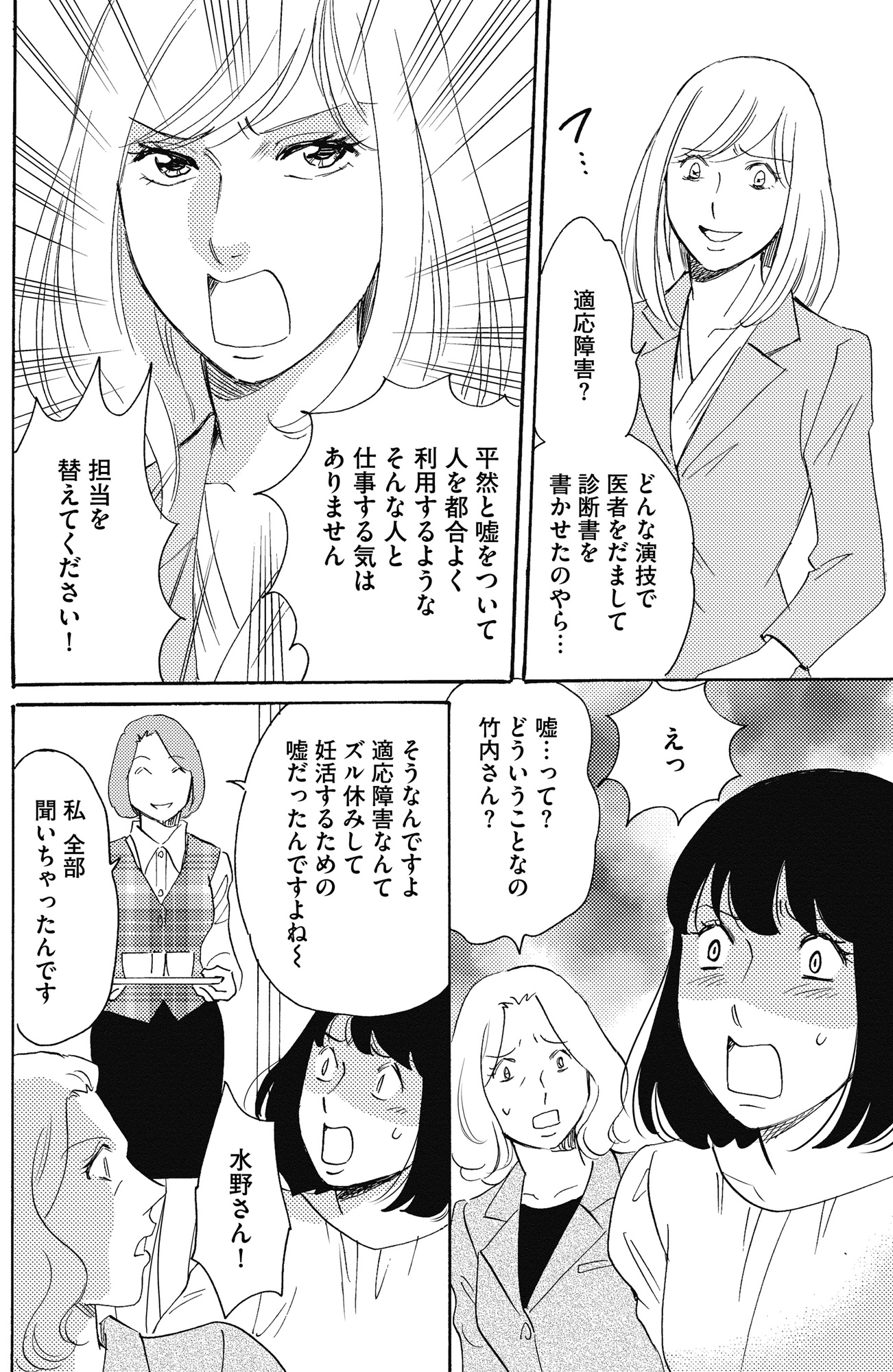 いざ反撃!適応障害と嘘をつき、休職して妊活していた正社員に報復を【自称うつ女、仕事しろ! #10】 2025.08.29 LIFE マンガ試し読みマンガ試し読み自称うつ女、仕事しろ! 試し読み 勤続10年のパート主婦・知美は年下正社員の芽衣の教育係に。しかし芽衣の態度は正規雇用のくせに無責任で給料泥棒さながら。それなのに「知美のせいでうつになった」と言い出して!? 読者が体験した「関わりたくない高飛車女」とのトラブルを描く作品集。 ※本記事は伊東爾子 著の書籍『自称うつ女、仕事しろ! ~仮病詐欺の逆パワハラOL~』から抜粋・編集しました。 ▶Renta!『自称うつ女、仕事しろ! ~仮病詐欺の逆パワハラOL~』 ▶30日間無料▶ Amazonの読み放題をチェック! 【99円で2カ月間】 Audible が無制限で聴ける! ▶楽天KOBO 初回購入金額のポイント最大70倍! スポンサーリンク 続きを読む 次のページへ >> 1 2 3 【注目の記事】 「優しかったころの夫に戻って欲しい」その“希望”にすがり続けた妻が、裏切られ、心を壊していくまで 1番対策が難しかった…!頬のたるみやほうれい線につながるNG食事習慣最後のひとつ 冬の寒さに負けない!そろそろ準備したい中綿アウター×【ユニクロ】バズりデニムの着こなし【40代の毎日コーデ】 【ユニクロ】カシミヤタッチニットで魅せる!旬のブラウンを効かせた洗練肩掛けテク【40代の毎日コーデ】 東大生が注意喚起!「鵜呑みにしてはいけない」SNSで「でたらめの受験情報」を発信する人の特徴とは この記事は OTONA SALONE1 スポンサーリンク スポンサーリンク 【人気の関連記事】 40代。もう私、いつ死んだっていい気がするけど | あした死ぬには、#1 突然の病気。更年期障害。取れない疲労、お金の不安、これからの人生の迷い……。40代がぶち当たる「壁」をあまりにもリアルに描き出し、熱く静かな共感をさらった雁須磨子さ… 人前では「完璧な夫婦」を演じる夫。普段は私を無視してるって、誰も知らない【女40代はおそろしい#11】 40歳・フリーデザイナーの丸山ふさ子。 夫との攻防戦の末、「共働きだけど夫のほうが家事育児多め」という関係にやっとたどり着く。バリキャリ会社員のまい、起業家のかお… 年齢、たまに忘れてない?アラフォーあるあるが「共感しかない」と話題 「最近、若い頃と比べて何かが違う……」そんなモヤモヤを抱えているアラフォーのみなさん、必見!イラストレーターのRingoman(@ringo_fashion)さんがインスタグラムに投稿…