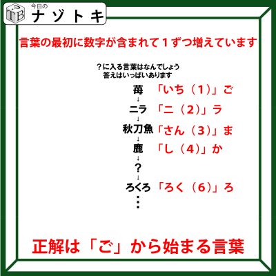 クイズです!「苺→ニラ→秋刀魚→鹿→?→ろくろ」?に入る言葉はなんでしょう。正解はいっぱいありますよ【難易度LV2.・甘口】