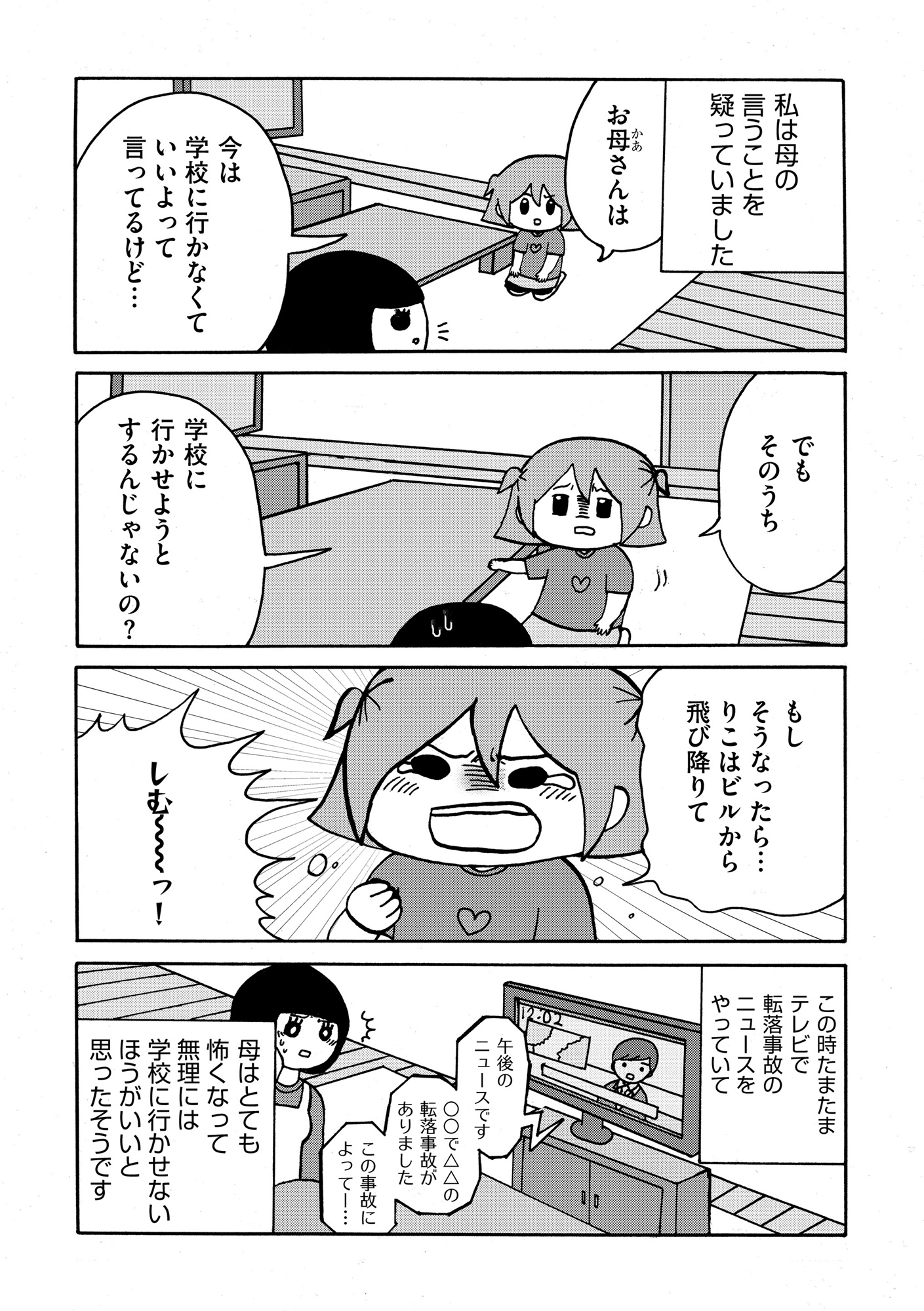 「小学校は行かせるべき」の父と「行くつもりのない」私の板挟みになる母【幼稚園から不登校の私 #5】 2025.09.05 LIFE マンガ試し読み幼稚園から不登校の私が 試し読みマンガ試し読み 幼稚園を中退し、小学校・中学校・高校に行かなかったものの、一念発起して大検を受検し、大学に進学するまでを「不登校児本人」が描くコミックエッセイ。 不登校児の日常生活とは?親の心境とは?学校に行かなくて良かったこと、悪かったことは…? 不登校児から見たさまざまな事象をご紹介! ※本記事はひろさきりこ著の電子書籍『幼稚園から不登校の私が、大学生になるまで』から抜粋・編集しました。 ▶Renta!『幼稚園から不登校の私が大学生になるまで』 ▶30日間無料▶ Amazonの読み放題をチェック! 【99円で2カ月間】 Audible が無制限で聴ける! ▶楽天KOBO 初回購入金額のポイント最大70倍! スポンサーリンク 続きを読む 次のページへ >> 1 2 3 【注目の記事】 48歳、高コスパコートをマネキン買いしたばかりのPTA中受ママが「羽織るだけでコーデ偏差値が爆上がりする」アイテムに出会ってしまい 「優しかったころの夫に戻って欲しい」その“希望”にすがり続けた妻が、裏切られ、心を壊していくまで 今シーズン着こなしたい【ユニクロ】の優秀スウェットパンツ。大人かっこいい着こなしのお手本スタイル【40代の毎日コーデ】 1番対策が難しかった…!頬のたるみやほうれい線につながるNG食事習慣最後のひとつ スウェットのカジュアルをきれいめに昇華!爽やかさ満点の着こなし【40代の毎日コーデ】 この記事は OTONA SALONE1 スポンサーリンク スポンサーリンク 【人気の関連記事】 40代。もう私、いつ死んだっていい気がするけど | あした死ぬには、#1 突然の病気。更年期障害。取れない疲労、お金の不安、これからの人生の迷い……。40代がぶち当たる「壁」をあまりにもリアルに描き出し、熱く静かな共感をさらった雁須磨子さ… 人前では「完璧な夫婦」を演じる夫。普段は私を無視してるって、誰も知らない【女40代はおそろしい#11】 40歳・フリーデザイナーの丸山ふさ子。 夫との攻防戦の末、「共働きだけど夫のほうが家事育児多め」という関係にやっとたどり着く。バリキャリ会社員のまい、起業家のかお… 年齢、たまに忘れてない?アラフォーあるあるが「共感しかない」と話題 「最近、若い頃と比べて何かが違う……」そんなモヤモヤを抱えているアラフォーのみなさん、必見!イラストレーターのRingoman(@ringo_fashion)さんがインスタグラムに投稿…