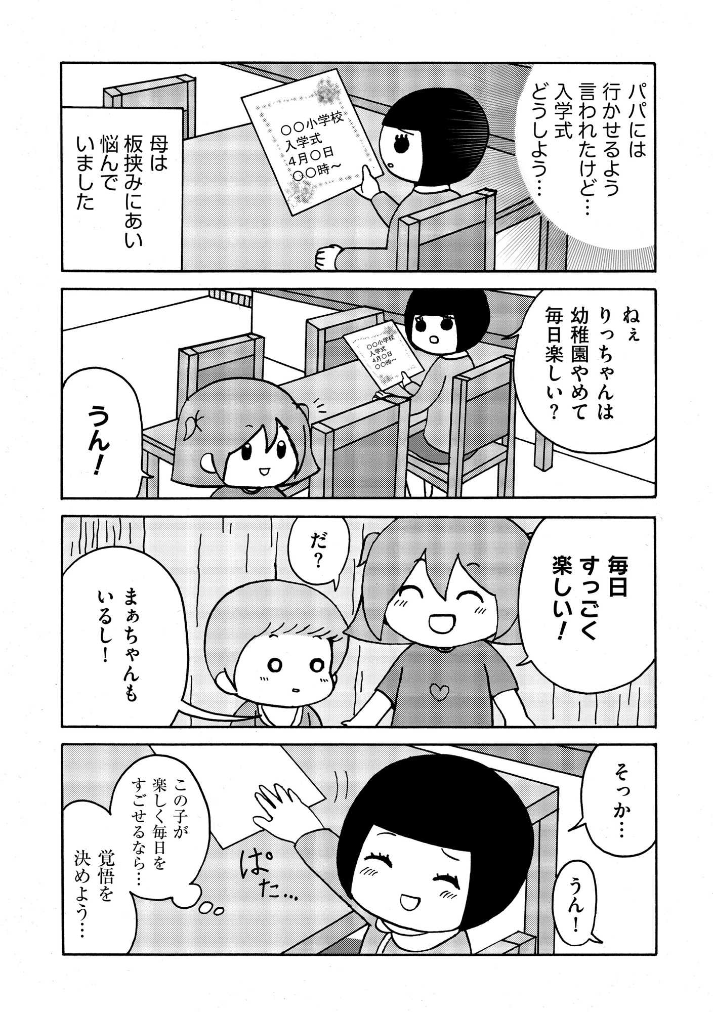 「小学校は行かせるべき」の父と「行くつもりのない」私の板挟みになる母【幼稚園から不登校の私 #5】 2025.09.05 LIFE 幼稚園から不登校の私が 試し読み試し読みマンガマンガ試し読み ▶Renta!『幼稚園から不登校の私が大学生になるまで』 ▶30日間無料▶ Amazonの読み放題をチェック! 【99円で2カ月間】 Audible が無制限で聴ける! ▶楽天KOBO 初回購入金額のポイント最大70倍! スポンサーリンク 次のページへ >> 1 2 3 【注目の記事】 48歳、高コスパコートをマネキン買いしたばかりのPTA中受ママが「羽織るだけでコーデ偏差値が爆上がりする」アイテムに出会ってしまい 「優しかったころの夫に戻って欲しい」その“希望”にすがり続けた妻が、裏切られ、心を壊していくまで 今シーズン着こなしたい【ユニクロ】の優秀スウェットパンツ。大人かっこいい着こなしのお手本スタイル【40代の毎日コーデ】 1番対策が難しかった…!頬のたるみやほうれい線につながるNG食事習慣最後のひとつ スウェットのカジュアルをきれいめに昇華!爽やかさ満点の着こなし【40代の毎日コーデ】 この記事は OTONA SALONE1 スポンサーリンク スポンサーリンク 【人気の関連記事】 40代。もう私、いつ死んだっていい気がするけど | あした死ぬには、#1 突然の病気。更年期障害。取れない疲労、お金の不安、これからの人生の迷い……。40代がぶち当たる「壁」をあまりにもリアルに描き出し、熱く静かな共感をさらった雁須磨子さ… 人前では「完璧な夫婦」を演じる夫。普段は私を無視してるって、誰も知らない【女40代はおそろしい#11】 40歳・フリーデザイナーの丸山ふさ子。 夫との攻防戦の末、「共働きだけど夫のほうが家事育児多め」という関係にやっとたどり着く。バリキャリ会社員のまい、起業家のかお… 年齢、たまに忘れてない?アラフォーあるあるが「共感しかない」と話題 「最近、若い頃と比べて何かが違う……」そんなモヤモヤを抱えているアラフォーのみなさん、必見!イラストレーターのRingoman(@ringo_fashion)さんがインスタグラムに投稿…