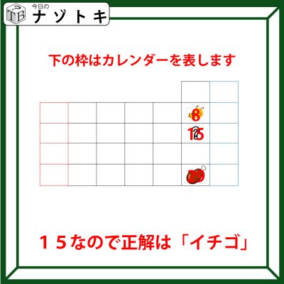 ハテナの部分は15日のところですのでできそうな語呂合わせは「イチゴ」ですね。正解は「イチゴ」でした。