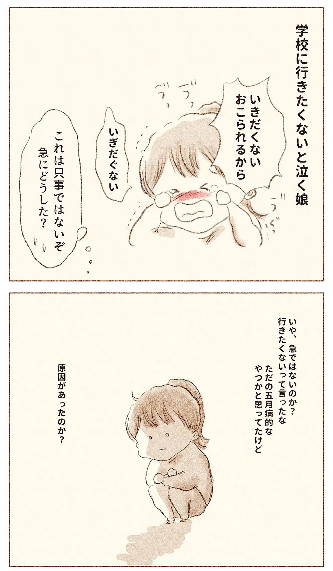 宿題のプリントを紛失。「怒られるから学校に行きたくないと」と突然娘が大泣き!? 【娘が小1で不登校になりました 先生が怖くて学校に行けない #3】 2025.09.15 LIFE マンガ試し読み娘が小1で不登校になりました 先生が怖くて学校に行けない 試し読み不登校マンガ試し読み ▶Renta!『娘が小1で不登校になりました 先生が怖くて学校に行けない』 ▶30日間無料▶ Amazonの読み放題をチェック! 【99円で2カ月間】 Audible が無制限で聴ける! ▶楽天KOBO 初回購入金額のポイント最大70倍! スポンサーリンク 次のページへ >> 1 2 3 4 【注目の記事】 1番対策が難しかった…!頬のたるみやほうれい線につながるNG食事習慣最後のひとつ 冬の寒さに負けない!そろそろ準備したい中綿アウター×【ユニクロ】バズりデニムの着こなし【40代の毎日コーデ】 【ユニクロ】カシミヤタッチニットで魅せる!旬のブラウンを効かせた洗練肩掛けテク【40代の毎日コーデ】 東大生が注意喚起!「鵜呑みにしてはいけない」SNSで「でたらめの受験情報」を発信する人の特徴とは 「東大受験が簡単!?」な難関私立高出身者。天才たちの受験勉強、その驚きの実態とは この記事は OTONA SALONE1 スポンサーリンク スポンサーリンク 【人気の関連記事】 40代。もう私、いつ死んだっていい気がするけど | あした死ぬには、#1 突然の病気。更年期障害。取れない疲労、お金の不安、これからの人生の迷い……。40代がぶち当たる「壁」をあまりにもリアルに描き出し、熱く静かな共感をさらった雁須磨子さ… 人前では「完璧な夫婦」を演じる夫。普段は私を無視してるって、誰も知らない【女40代はおそろしい#11】 40歳・フリーデザイナーの丸山ふさ子。 夫との攻防戦の末、「共働きだけど夫のほうが家事育児多め」という関係にやっとたどり着く。バリキャリ会社員のまい、起業家のかお… 年齢、たまに忘れてない?アラフォーあるあるが「共感しかない」と話題 「最近、若い頃と比べて何かが違う……」そんなモヤモヤを抱えているアラフォーのみなさん、必見!イラストレーターのRingoman(@ringo_fashion)さんがインスタグラムに投稿…