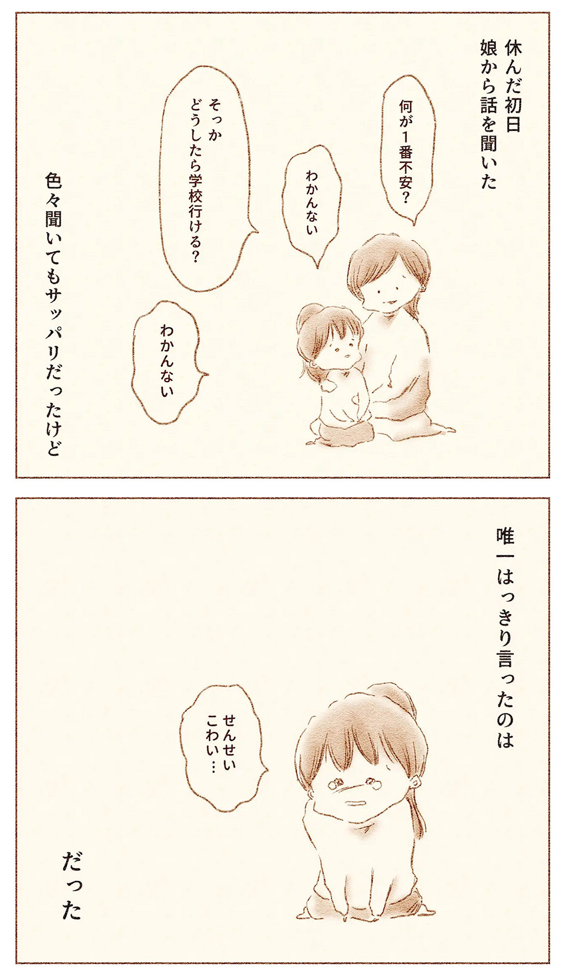 何が1番不安?娘に寄り添う母。「せんせいこわい…」娘の不登校は‟担任の先生“が原因だったことが判明!【娘が小1で不登校になりました 先生が怖くて学校に行けない #5】 2025.09.17 LIFE 娘が小1で不登校になりました 先生が怖くて学校に行けない 試し読み不登校マンガマンガ試し読み試し読み ▶Renta!『娘が小1で不登校になりました 先生が怖くて学校に行けない』 ▶30日間無料▶ Amazonの読み放題をチェック! 【99円で2カ月間】 Audible が無制限で聴ける! ▶楽天KOBO 初回購入金額のポイント最大70倍! スポンサーリンク 次のページへ >> 1 2 3 4 【注目の記事】 1番対策が難しかった…!頬のたるみやほうれい線につながるNG食事習慣最後のひとつ 冬の寒さに負けない!そろそろ準備したい中綿アウター×【ユニクロ】バズりデニムの着こなし【40代の毎日コーデ】 【ユニクロ】カシミヤタッチニットで魅せる!旬のブラウンを効かせた洗練肩掛けテク【40代の毎日コーデ】 東大生が注意喚起!「鵜呑みにしてはいけない」SNSで「でたらめの受験情報」を発信する人の特徴とは 「東大受験が簡単!?」な難関私立高出身者。天才たちの受験勉強、その驚きの実態とは この記事は OTONA SALONE1 スポンサーリンク スポンサーリンク 【人気の関連記事】 40代。もう私、いつ死んだっていい気がするけど | あした死ぬには、#1 突然の病気。更年期障害。取れない疲労、お金の不安、これからの人生の迷い……。40代がぶち当たる「壁」をあまりにもリアルに描き出し、熱く静かな共感をさらった雁須磨子さ… 人前では「完璧な夫婦」を演じる夫。普段は私を無視してるって、誰も知らない【女40代はおそろしい#11】 40歳・フリーデザイナーの丸山ふさ子。 夫との攻防戦の末、「共働きだけど夫のほうが家事育児多め」という関係にやっとたどり着く。バリキャリ会社員のまい、起業家のかお… 年齢、たまに忘れてない?アラフォーあるあるが「共感しかない」と話題 「最近、若い頃と比べて何かが違う……」そんなモヤモヤを抱えているアラフォーのみなさん、必見!イラストレーターのRingoman(@ringo_fashion)さんがインスタグラムに投稿…