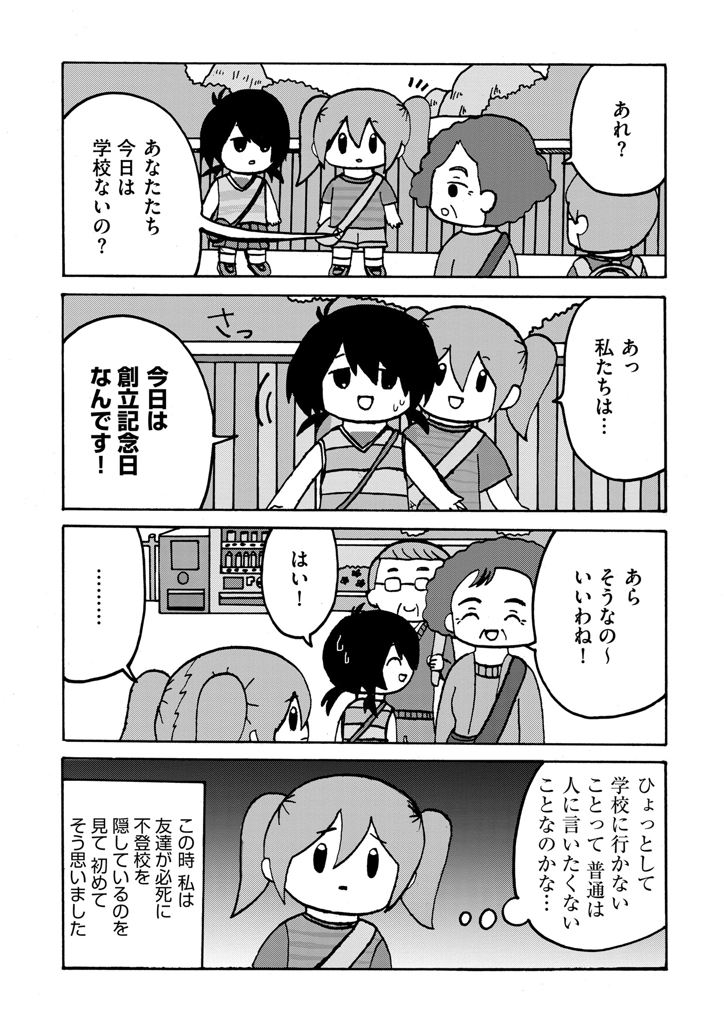 「学校に行かない」ことって隠すことなの?恥ずかしいことなの?【幼稚園から不登校の私 #24】 2025.09.14 LIFE 試し読みマンガマンガ試し読み幼稚園から不登校の私が 試し読み 幼稚園を中退し、小学校・中学校・高校に行かなかったものの、一念発起して大検を受検し、大学に進学するまでを「不登校児本人」が描くコミックエッセイ。 不登校児の日常生活とは?親の心境とは?学校に行かなくて良かったこと、悪かったことは…? 不登校児から見たさまざまな事象をご紹介! ※本記事はひろさきりこ著の電子書籍『幼稚園から不登校の私が、大学生になるまで』から抜粋・編集しました。 ▶Renta!『幼稚園から不登校の私が大学生になるまで』 ▶30日間無料▶ Amazonの読み放題をチェック! 【99円で2カ月間】 Audible が無制限で聴ける! ▶楽天KOBO 初回購入金額のポイント最大70倍! スポンサーリンク 続きを読む 次のページへ >> 1 2 3 【注目の記事】 48歳、高コスパコートをマネキン買いしたばかりのPTA中受ママが「羽織るだけでコーデ偏差値が爆上がりする」アイテムに出会ってしまい 「優しかったころの夫に戻って欲しい」その“希望”にすがり続けた妻が、裏切られ、心を壊していくまで 今シーズン着こなしたい【ユニクロ】の優秀スウェットパンツ。大人かっこいい着こなしのお手本スタイル【40代の毎日コーデ】 1番対策が難しかった…!頬のたるみやほうれい線につながるNG食事習慣最後のひとつ スウェットのカジュアルをきれいめに昇華!爽やかさ満点の着こなし【40代の毎日コーデ】 この記事は OTONA SALONE1 スポンサーリンク スポンサーリンク 【人気の関連記事】 40代。もう私、いつ死んだっていい気がするけど | あした死ぬには、#1 突然の病気。更年期障害。取れない疲労、お金の不安、これからの人生の迷い……。40代がぶち当たる「壁」をあまりにもリアルに描き出し、熱く静かな共感をさらった雁須磨子さ… 人前では「完璧な夫婦」を演じる夫。普段は私を無視してるって、誰も知らない【女40代はおそろしい#11】 40歳・フリーデザイナーの丸山ふさ子。 夫との攻防戦の末、「共働きだけど夫のほうが家事育児多め」という関係にやっとたどり着く。バリキャリ会社員のまい、起業家のかお… 年齢、たまに忘れてない?アラフォーあるあるが「共感しかない」と話題 「最近、若い頃と比べて何かが違う……」そんなモヤモヤを抱えているアラフォーのみなさん、必見!イラストレーターのRingoman(@ringo_fashion)さんがインスタグラムに投稿…