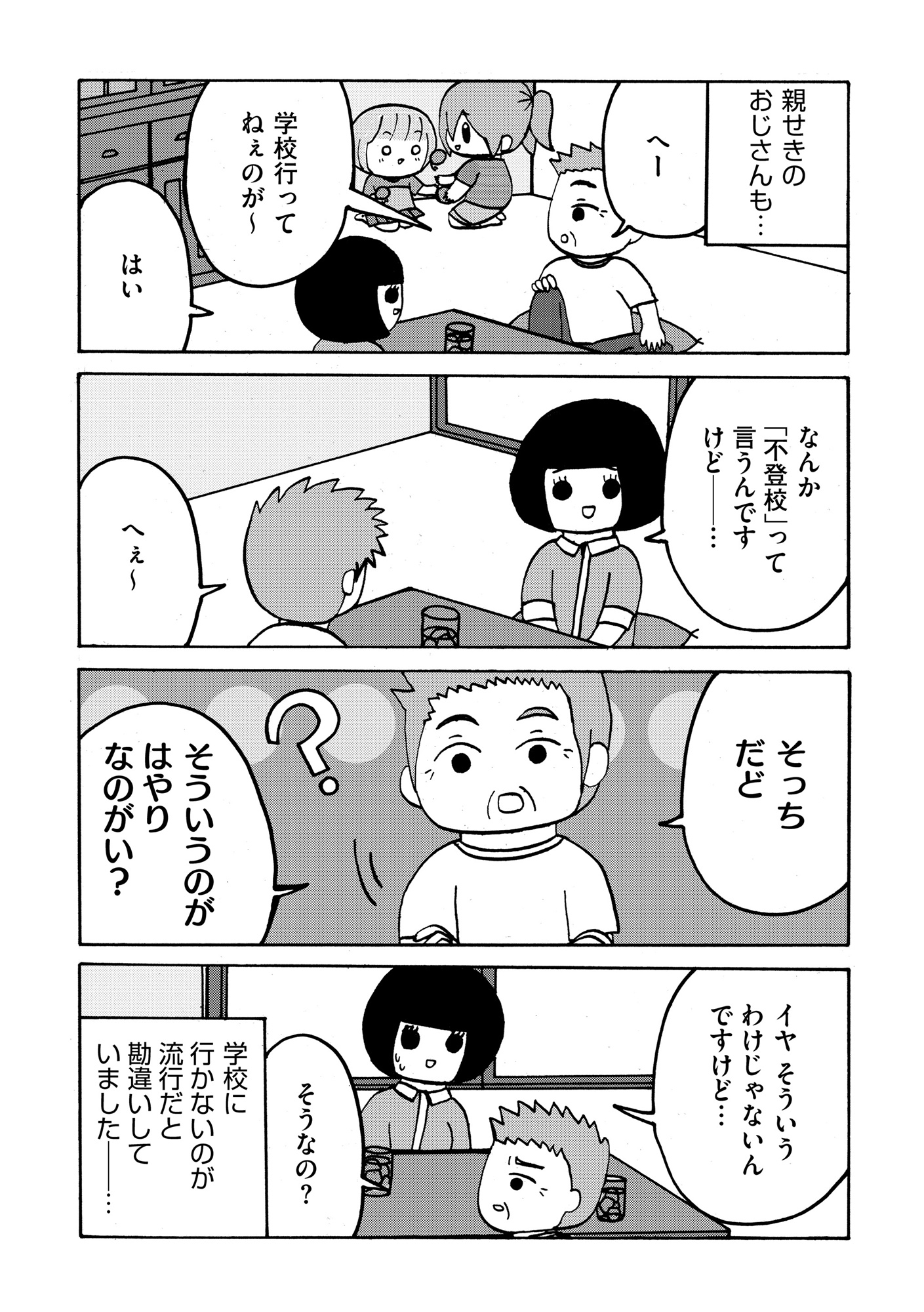 「不登校ってのが流行りなのか?」いろんな親戚に会ってみて思うこと【幼稚園から不登校の私 #29】 2025.09.17 LIFE 幼稚園から不登校の私が 試し読みマンガ試し読み試し読みマンガ 幼稚園を中退し、小学校・中学校・高校に行かなかったものの、一念発起して大検を受検し、大学に進学するまでを「不登校児本人」が描くコミックエッセイ。 不登校児の日常生活とは?親の心境とは?学校に行かなくて良かったこと、悪かったことは…? 不登校児から見たさまざまな事象をご紹介! ※本記事はひろさきりこ著の電子書籍『幼稚園から不登校の私が、大学生になるまで』から抜粋・編集しました。 ▶Renta!『幼稚園から不登校の私が大学生になるまで』 ▶30日間無料▶ Amazonの読み放題をチェック! 【99円で2カ月間】 Audible が無制限で聴ける! ▶楽天KOBO 初回購入金額のポイント最大70倍! スポンサーリンク 続きを読む 次のページへ >> 1 2 3 【注目の記事】 つい毎日やりがち。肌年齢マイナス14歳美容のプロがやめてよかった、睡眠の質を落とす夜の習慣2つ 48歳、高コスパコートをマネキン買いしたばかりのPTA中受ママが「羽織るだけでコーデ偏差値が爆上がりする」アイテムに出会ってしまい 「優しかったころの夫に戻って欲しい」その“希望”にすがり続けた妻が、裏切られ、心を壊していくまで 今シーズン着こなしたい【ユニクロ】の優秀スウェットパンツ。大人かっこいい着こなしのお手本スタイル【40代の毎日コーデ】 1番対策が難しかった…!頬のたるみやほうれい線につながるNG食事習慣最後のひとつ この記事は OTONA SALONE1 スポンサーリンク スポンサーリンク 【人気の関連記事】 40代。もう私、いつ死んだっていい気がするけど | あした死ぬには、#1 突然の病気。更年期障害。取れない疲労、お金の不安、これからの人生の迷い……。40代がぶち当たる「壁」をあまりにもリアルに描き出し、熱く静かな共感をさらった雁須磨子さ… 人前では「完璧な夫婦」を演じる夫。普段は私を無視してるって、誰も知らない【女40代はおそろしい#11】 40歳・フリーデザイナーの丸山ふさ子。 夫との攻防戦の末、「共働きだけど夫のほうが家事育児多め」という関係にやっとたどり着く。バリキャリ会社員のまい、起業家のかお… 年齢、たまに忘れてない?アラフォーあるあるが「共感しかない」と話題 「最近、若い頃と比べて何かが違う……」そんなモヤモヤを抱えているアラフォーのみなさん、必見!イラストレーターのRingoman(@ringo_fashion)さんがインスタグラムに投稿…