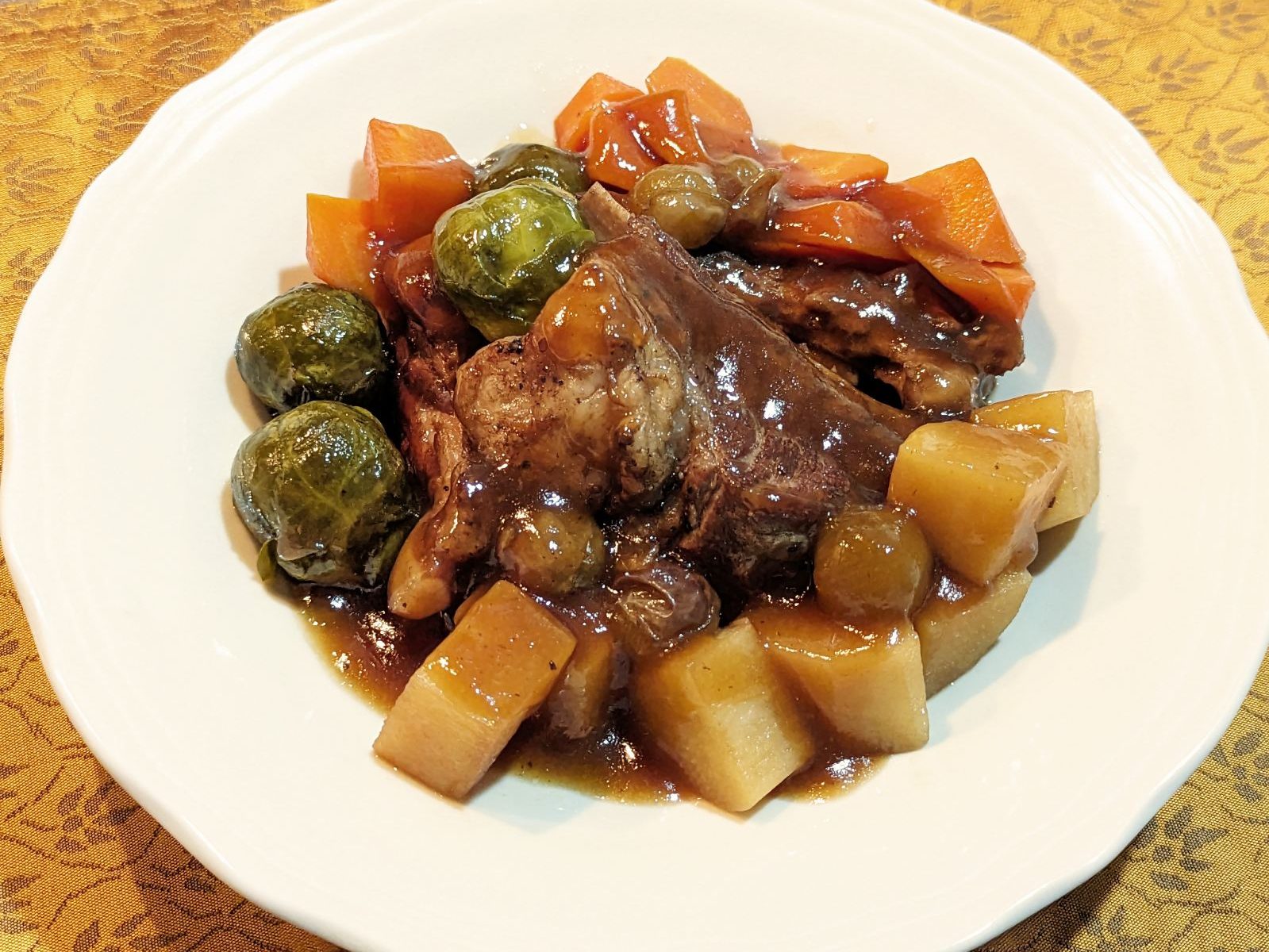 作り方は、まず豚スペアリブ(300g)にしょうゆ(大さじ1)・酒(大さじ1)・胡椒(少々)で下味をつけます。山芋(100g)は皮をむいて一口大に切り、ぶどう(10個程度)・芽キャベツ(6個)は洗っておきます。鍋にごま油をひいて豚スペアリブを炒め、表面に焦げ色がついたら、山芋・ぶどう・芽キャベツを入れて、水(300ml)・きび砂糖(大さじ4)・しょうゆ(大さじ3)・酒(大さじ2)・りんご酢(大さじ2)を加えて中~強火で30分ほど煮たてます。液量が約半分量になったら、豚スペアリブ・野菜を盛りつけ、水溶き片栗粉(水:大さじ2、片栗粉:大さじ1)を加えてとろみをつけ、豚肉・野菜の上からかけたら出来上がりです。