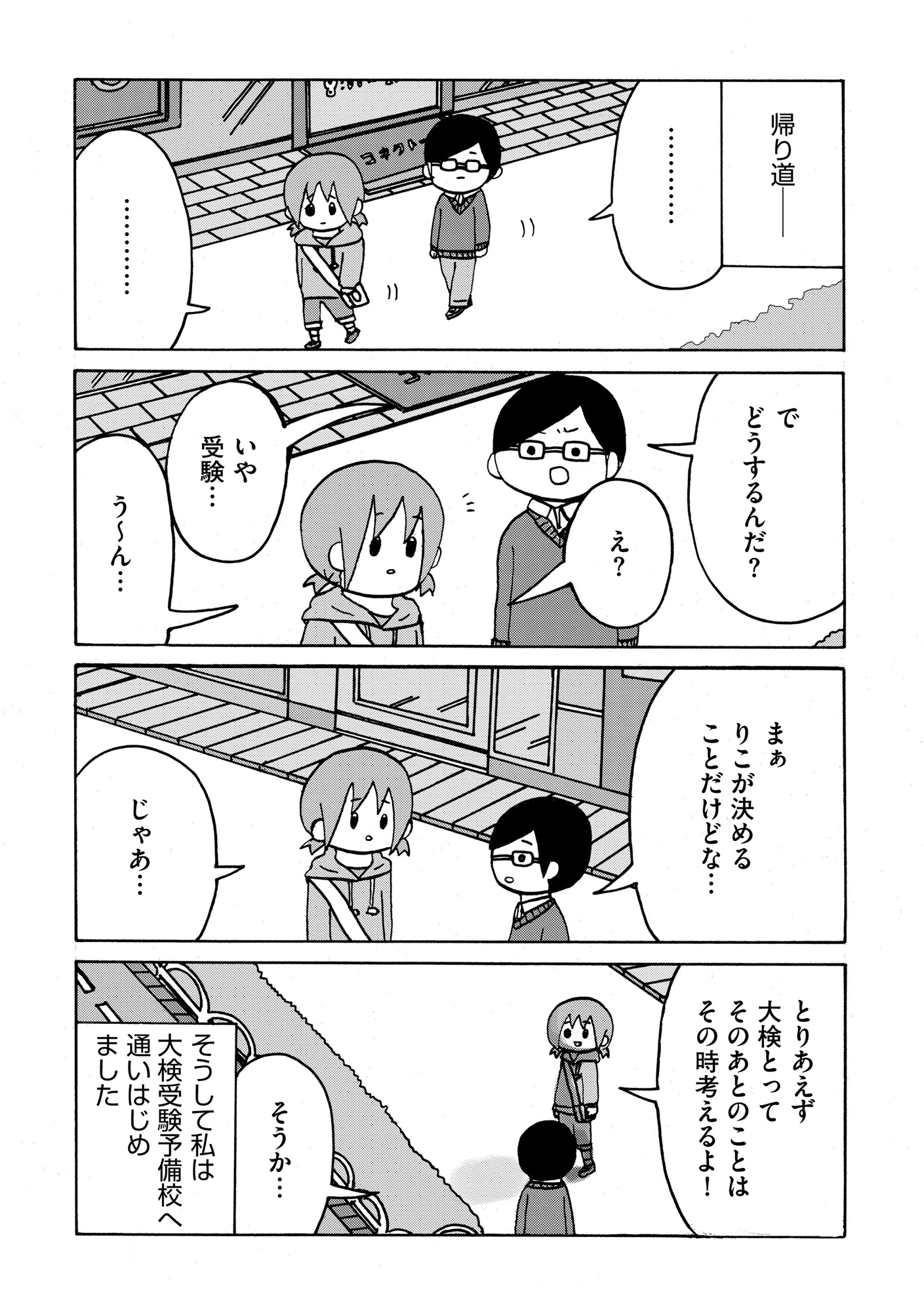 「大検」と「大学受験」の大きな違いとは【幼稚園から不登校の私 #43】 2025.09.24 LIFE マンガマンガ試し読み幼稚園から不登校の私が 試し読み試し読み ▶Renta!『幼稚園から不登校の私が大学生になるまで』 ▶30日間無料▶ Amazonの読み放題をチェック! 【99円で2カ月間】 Audible が無制限で聴ける! ▶楽天KOBO 初回購入金額のポイント最大70倍! スポンサーリンク 次のページへ >> 1 2 3 【注目の記事】 「優しかったころの夫に戻って欲しい」その“希望”にすがり続けた妻が、裏切られ、心を壊していくまで 1番対策が難しかった…!頬のたるみやほうれい線につながるNG食事習慣最後のひとつ 冬の寒さに負けない!そろそろ準備したい中綿アウター×【ユニクロ】バズりデニムの着こなし【40代の毎日コーデ】 【ユニクロ】カシミヤタッチニットで魅せる!旬のブラウンを効かせた洗練肩掛けテク【40代の毎日コーデ】 東大生が注意喚起!「鵜呑みにしてはいけない」SNSで「でたらめの受験情報」を発信する人の特徴とは この記事は OTONA SALONE1 スポンサーリンク スポンサーリンク 【人気の関連記事】 40代。もう私、いつ死んだっていい気がするけど | あした死ぬには、#1 突然の病気。更年期障害。取れない疲労、お金の不安、これからの人生の迷い……。40代がぶち当たる「壁」をあまりにもリアルに描き出し、熱く静かな共感をさらった雁須磨子さ… 人前では「完璧な夫婦」を演じる夫。普段は私を無視してるって、誰も知らない【女40代はおそろしい#11】 40歳・フリーデザイナーの丸山ふさ子。 夫との攻防戦の末、「共働きだけど夫のほうが家事育児多め」という関係にやっとたどり着く。バリキャリ会社員のまい、起業家のかお… 年齢、たまに忘れてない?アラフォーあるあるが「共感しかない」と話題 「最近、若い頃と比べて何かが違う……」そんなモヤモヤを抱えているアラフォーのみなさん、必見!イラストレーターのRingoman(@ringo_fashion)さんがインスタグラムに投稿…