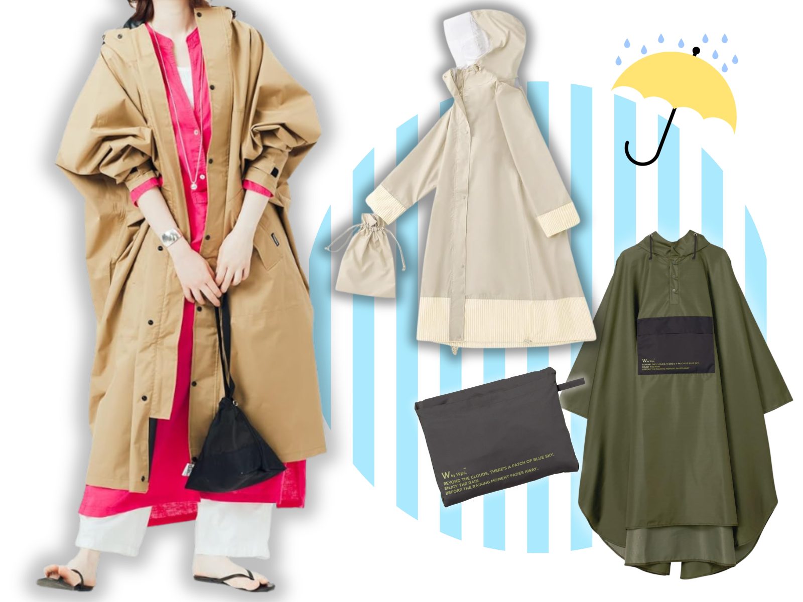 【リュックを背負ったままでもラク】背中のプリーツで身幅を調整OK! すそをしぼって雨をブロック。袖先のストライプ柄がかわいい♪