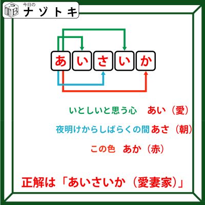 そのことを踏まえてそれぞれ2文字の言葉を考えていきましょう。緑は2本ありますがどちらも同じ文字がはいります。入る言葉は緑は「あい(愛)」、水色は「あさ(朝)」、赤色はもちろん「あか(赤)」です。