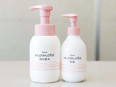 スキンケアで使用するのは、(株)ナリス化粧品の高保湿スキンケアブランド「momote(モモテ)」の泡化粧水と乳液。こちらは、実際に介護現場で働くセラピストや、高齢者の声(身体の変化に伴う化粧品の使いづらさなど)を受け、(一社)日本介護美容セラピスト協会と(株)ナリス化粧品が共同開発した商品です。
