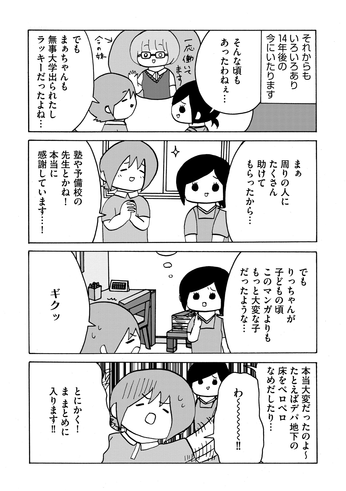 意外!?不登校でよかったこととは【幼稚園から不登校の私 #56】 2025.09.30 LIFE マンガ幼稚園から不登校の私が 試し読み試し読みマンガ試し読み 幼稚園を中退し、小学校・中学校・高校に行かなかったものの、一念発起して大検を受検し、大学に進学するまでを「不登校児本人」が描くコミックエッセイ。 不登校児の日常生活とは?親の心境とは?学校に行かなくて良かったこと、悪かったことは…? 不登校児から見たさまざまな事象をご紹介! ※本記事はひろさきりこ著の電子書籍『幼稚園から不登校の私が、大学生になるまで』から抜粋・編集しました。 ▶Renta!『幼稚園から不登校の私が大学生になるまで』 ▶30日間無料▶ Amazonの読み放題をチェック! 【99円で2カ月間】 Audible が無制限で聴ける! ▶楽天KOBO 初回購入金額のポイント最大70倍! スポンサーリンク 続きを読む 次のページへ >> 1 2 3 【注目の記事】 1番対策が難しかった…!頬のたるみやほうれい線につながるNG食事習慣最後のひとつ 冬の寒さに負けない!そろそろ準備したい中綿アウター×【ユニクロ】バズりデニムの着こなし【40代の毎日コーデ】 【ユニクロ】カシミヤタッチニットで魅せる!旬のブラウンを効かせた洗練肩掛けテク【40代の毎日コーデ】 東大生が注意喚起!「鵜呑みにしてはいけない」SNSで「でたらめの受験情報」を発信する人の特徴とは 「東大受験が簡単!?」な難関私立高出身者。天才たちの受験勉強、その驚きの実態とは この記事は OTONA SALONE1 スポンサーリンク スポンサーリンク 【人気の関連記事】 40代。もう私、いつ死んだっていい気がするけど | あした死ぬには、#1 突然の病気。更年期障害。取れない疲労、お金の不安、これからの人生の迷い……。40代がぶち当たる「壁」をあまりにもリアルに描き出し、熱く静かな共感をさらった雁須磨子さ… 人前では「完璧な夫婦」を演じる夫。普段は私を無視してるって、誰も知らない【女40代はおそろしい#11】 40歳・フリーデザイナーの丸山ふさ子。 夫との攻防戦の末、「共働きだけど夫のほうが家事育児多め」という関係にやっとたどり着く。バリキャリ会社員のまい、起業家のかお… 年齢、たまに忘れてない?アラフォーあるあるが「共感しかない」と話題 「最近、若い頃と比べて何かが違う……」そんなモヤモヤを抱えているアラフォーのみなさん、必見!イラストレーターのRingoman(@ringo_fashion)さんがインスタグラムに投稿…