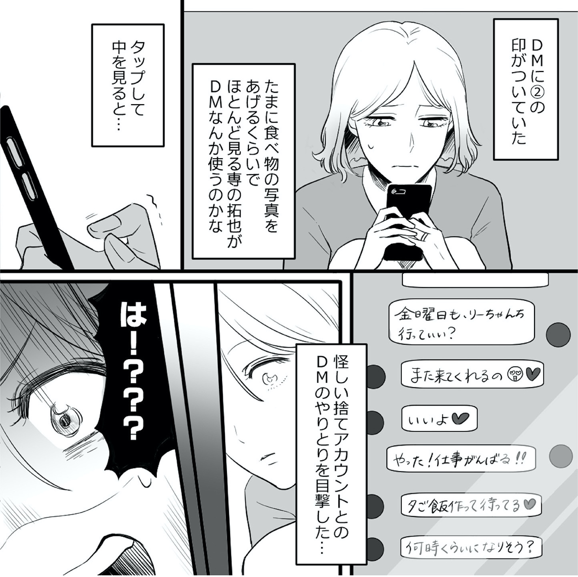 おいおいマジか…怪しい女とのDMのやりとりを見つける。夫はその女に頻繁に会っていることが発覚!【金曜に、夫を破滅させます #4】 2025.09.27 LOVE マンガ試し読み金曜に、夫を破滅させます ずっと幸せだと思ってた 試し読み試し読みマンガ夫婦関係 夫の拓也と結婚して2年目の美咲。共働きなのに家事は全て私任せで、義母からは執拗な“孫プレッシャー”をかけられている。 ある日、夫がずっとスマホを手放さないことが気になり、寝ている隙に中身を覗くと、怪しい女とのDMのやりとりを見つけ、夫の不倫が発覚! 「この不倫相手は一体誰なのか?」美咲はあらゆる手を使って、その正体を探ろうとするが…。 ※本記事は原作・されみ、企画・リアコミ、漫画・真青の電子書籍『金曜に、夫を破滅させます ずっと幸せだと思ってた』から一部抜粋・編集しました。 ▶Renta!『金曜に、夫を破滅させます ずっと幸せだと思ってた』 ▶30日間無料▶ Amazonの読み放題をチェック! 【99円で2カ月間】 Audible が無制限で聴ける! ▶楽天KOBO 初回購入金額のポイント最大70倍! スポンサーリンク 続きを読む 次のページへ >> 1 2 3 4 【注目の記事】 1番対策が難しかった…!頬のたるみやほうれい線につながるNG食事習慣最後のひとつ 冬の寒さに負けない!そろそろ準備したい中綿アウター×【ユニクロ】バズりデニムの着こなし【40代の毎日コーデ】 【ユニクロ】カシミヤタッチニットで魅せる!旬のブラウンを効かせた洗練肩掛けテク【40代の毎日コーデ】 東大生が注意喚起!「鵜呑みにしてはいけない」SNSで「でたらめの受験情報」を発信する人の特徴とは 「東大受験が簡単!?」な難関私立高出身者。天才たちの受験勉強、その驚きの実態とは この記事は OTONA SALONE1 スポンサーリンク スポンサーリンク 【人気の関連記事】 【なぜどく#7 45歳・A子さん編】地方は独身男が少ない!40代でやっと気づいたこと 【なぜ彼女は独身なのか?40代独女の本音 ♯7】アラフォー独身のイラストレーターNobbyさんが、絶賛婚活中の編集長・アサミといっしょに、婚活中の独身女性と「私たちはな… 【なぜどく#8】42歳独女が月額10万のセレブ婚活サロンに登録した結果… 【なぜ彼女は独身なの?40代独女の本音 ♯8】アラフォー独身のイラストレーターNobbyさんが、絶賛婚活中の編集長・アサミといっしょに、婚活中の独身女性と「私たちはなぜ… 【なぜどく#13 45歳・ヨーコさん編】バリキャリ女子は、婚活に迷走する? アラフォー独身のイラストレーターNobbyさんが、絶賛婚活中の編集長・アサミといっしょに、婚活中の独身女性と「私たちはなぜ婚活し続けるのか」まったり語り合う会のレポ…