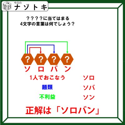 「1人でおこなう」というのは「ソロ」を表します。麺類とは「ソバ」を表します。下の不利益は「ソン」を表します。これで3つの単語が分かりました。