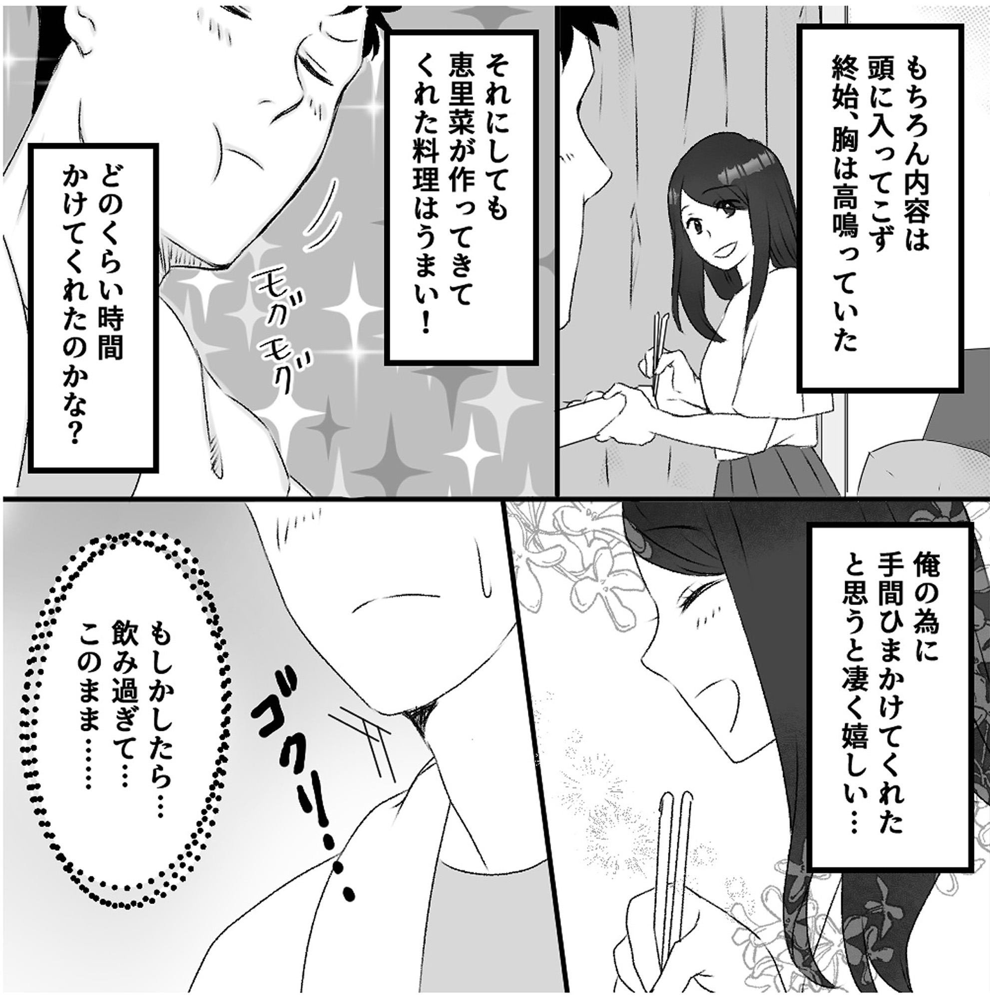 彼女の手料理とお酒を楽しんだ夜。距離が縮まった自宅デートで芽生える想い【最初から、全部ウソだった 妻のすべてを知った夫 #4】