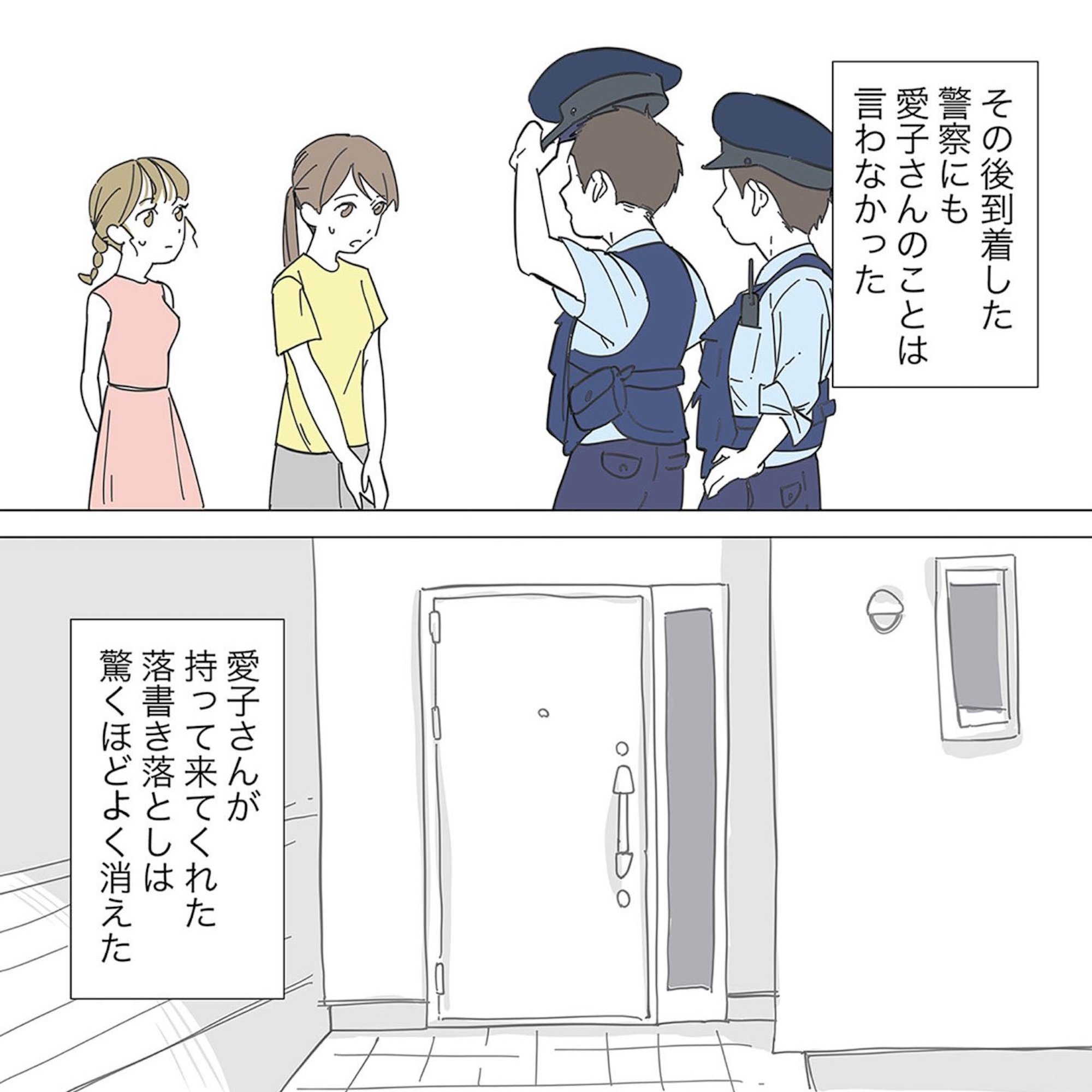 さらにとある深夜、インターホンを何度も執拗に鳴らされる。そしてドアスコープを覗くと、怒りに満ちた顔をしたママ友が立っていた…。