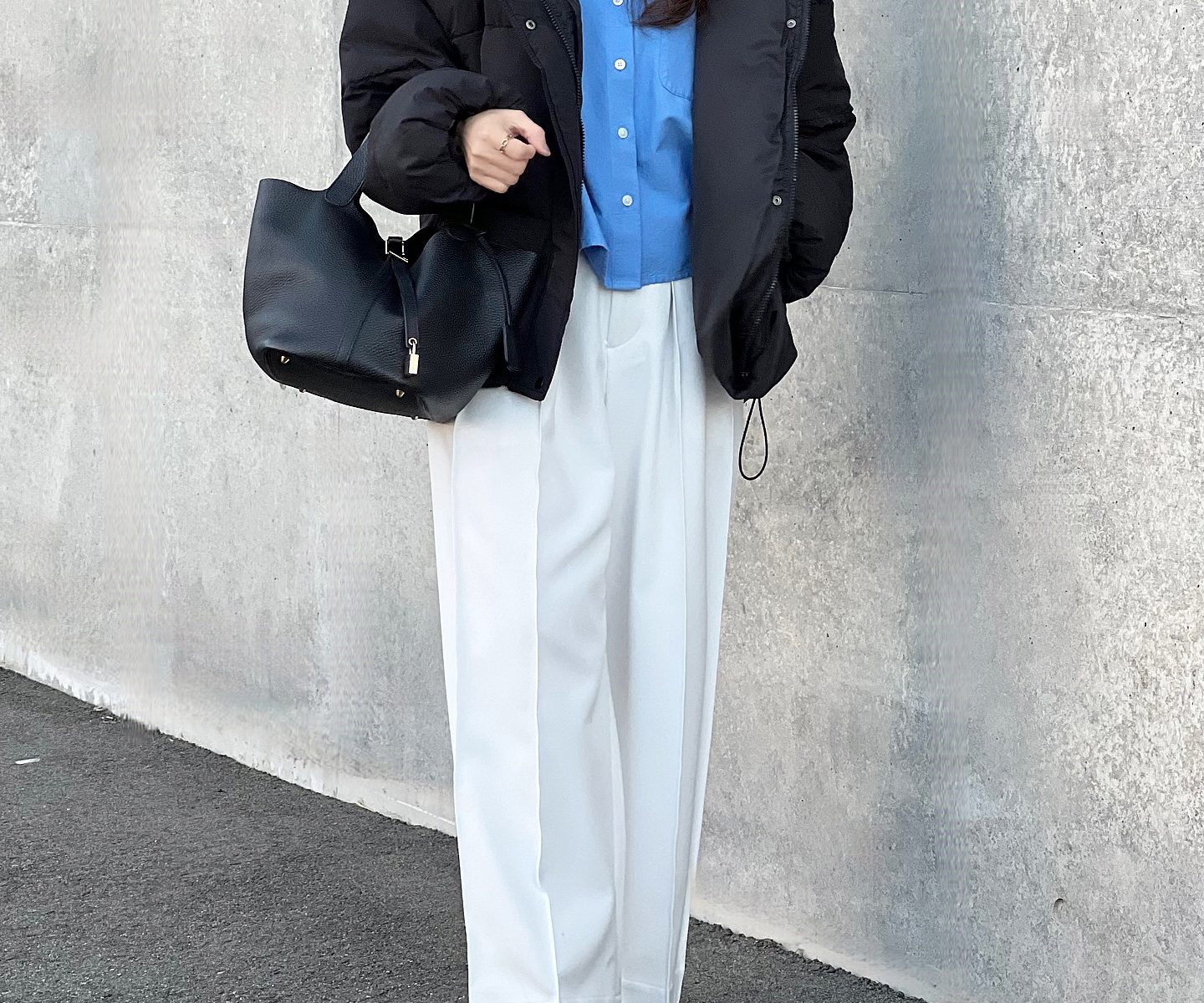 ボトムスにはクリーンな白のワイドパンツを選び、重くなりがちな冬の装いをパッと明るく仕上げています。足元はポインテッドトゥのパンプスでキリッとまとめ、カジュアルなアウターを品よく格上げ。動きやすさと防寒性を兼ね備えた、大人の日常に寄り添うスタイリングです。