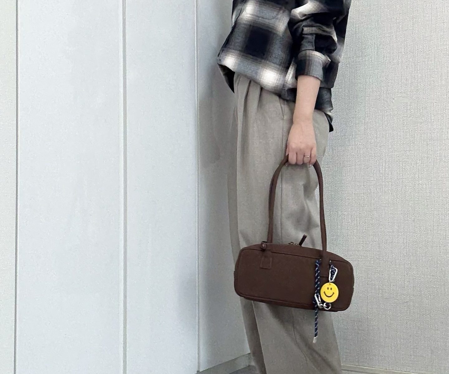 GUの「フランネルシャツ」2,490円(161cmでサイズL着用)のボタンを三つくらい開けて襟を抜き、後ろに抜いて着崩しているのがポイント。ボトムスにはGUのタックワイドパンツのやさしいベージュを選び、Iラインを意識したきれいめな印象をプラスしています。バッグや靴をブラウン系で揃えることで、統一感のある落ち着いた雰囲気を演出し、きれいめカジュアルに昇華させた、すぐに真似したい大人の着こなし術です。