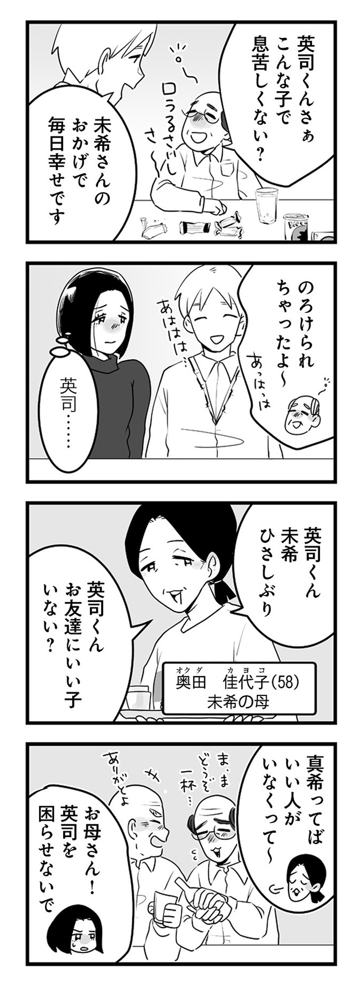 実家同士が仲良しなことに喜べない。そんな自分が嫌になる【その不倫、地獄行きです! #4】 2025.10.11 LIFE マンガ不倫マンガ試し読み試し読み夫婦関係その不倫、地獄行きです!―不倫制裁コーディネーター結子の記録― 試し読み ▶Renta!『その不倫、地獄行きです!―不倫制裁コーディネーター結子の記録―』 ▶30日間無料▶ Amazonの読み放題をチェック! 【99円で2カ月間】 Audible が無制限で聴ける! ▶楽天KOBO 初回購入金額のポイント最大70倍! スポンサーリンク 次のページへ >> 1 2 3 【注目の記事】 1番対策が難しかった…!頬のたるみやほうれい線につながるNG食事習慣最後のひとつ 冬の寒さに負けない!そろそろ準備したい中綿アウター×【ユニクロ】バズりデニムの着こなし【40代の毎日コーデ】 【ユニクロ】カシミヤタッチニットで魅せる!旬のブラウンを効かせた洗練肩掛けテク【40代の毎日コーデ】 東大生が注意喚起!「鵜呑みにしてはいけない」SNSで「でたらめの受験情報」を発信する人の特徴とは 「東大受験が簡単!?」な難関私立高出身者。天才たちの受験勉強、その驚きの実態とは この記事は OTONA SALONE4 スポンサーリンク スポンサーリンク 【人気の関連記事】 小泉今日子、前代未聞の不倫宣言でピンチを迎えたのは誰か? みなさんは”逆張り”という言葉をお聞きになったことがありますか?これは株式投資用語で、株価格が急変したとき、あえて流れに逆らって売買をすることを言います。奇しくも… 40代。もう私、いつ死んだっていい気がするけど | あした死ぬには、#1 突然の病気。更年期障害。取れない疲労、お金の不安、これからの人生の迷い……。40代がぶち当たる「壁」をあまりにもリアルに描き出し、熱く静かな共感をさらった雁須磨子さ… 人前では「完璧な夫婦」を演じる夫。普段は私を無視してるって、誰も知らない【女40代はおそろしい#11】 40歳・フリーデザイナーの丸山ふさ子。 夫との攻防戦の末、「共働きだけど夫のほうが家事育児多め」という関係にやっとたどり着く。バリキャリ会社員のまい、起業家のかお…