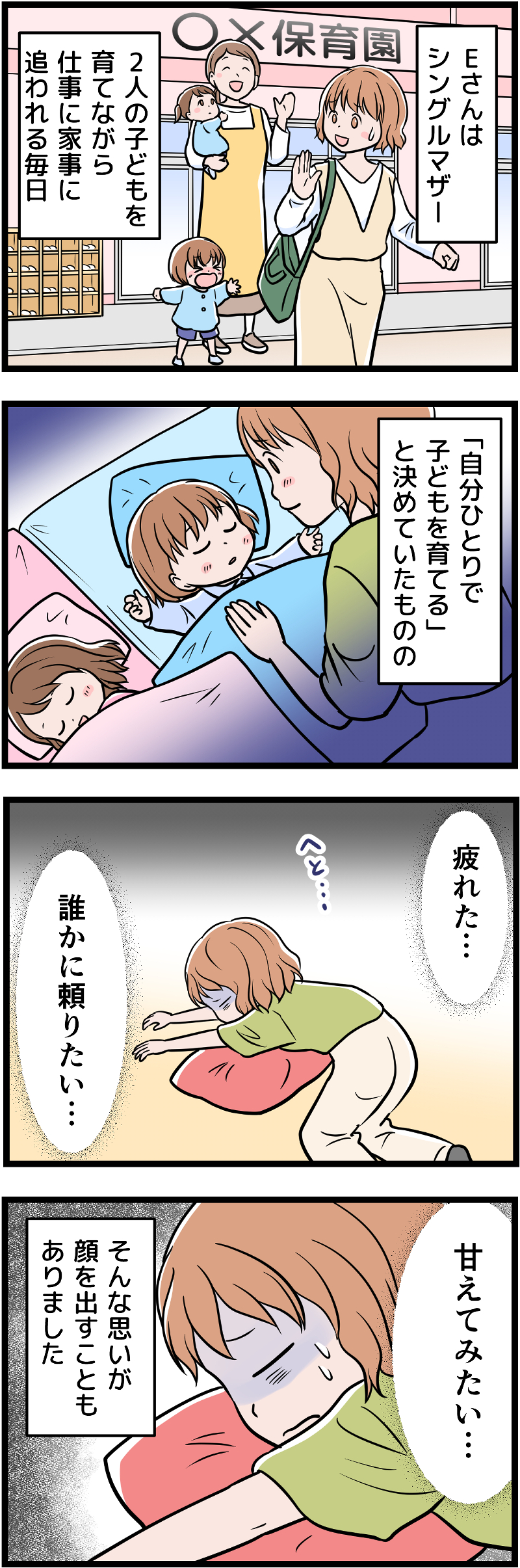 今回の主人公Eさんは、30代のシングルマザー。ふたりの子供を育てながら忙しく毎日を過ごしています。自分一人で子どもたちを守り育てる覚悟はありましたが、いつもクタクタ。「誰かに甘えてみたい」と弱気になってしまうこともありました。