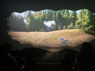森の散策を終えてシアターに向かいます。ここにもメッシュスクリーンが設置された大きな舞台があり、まずはオオカミの群れが鹿を追うストーリーがスタートします。