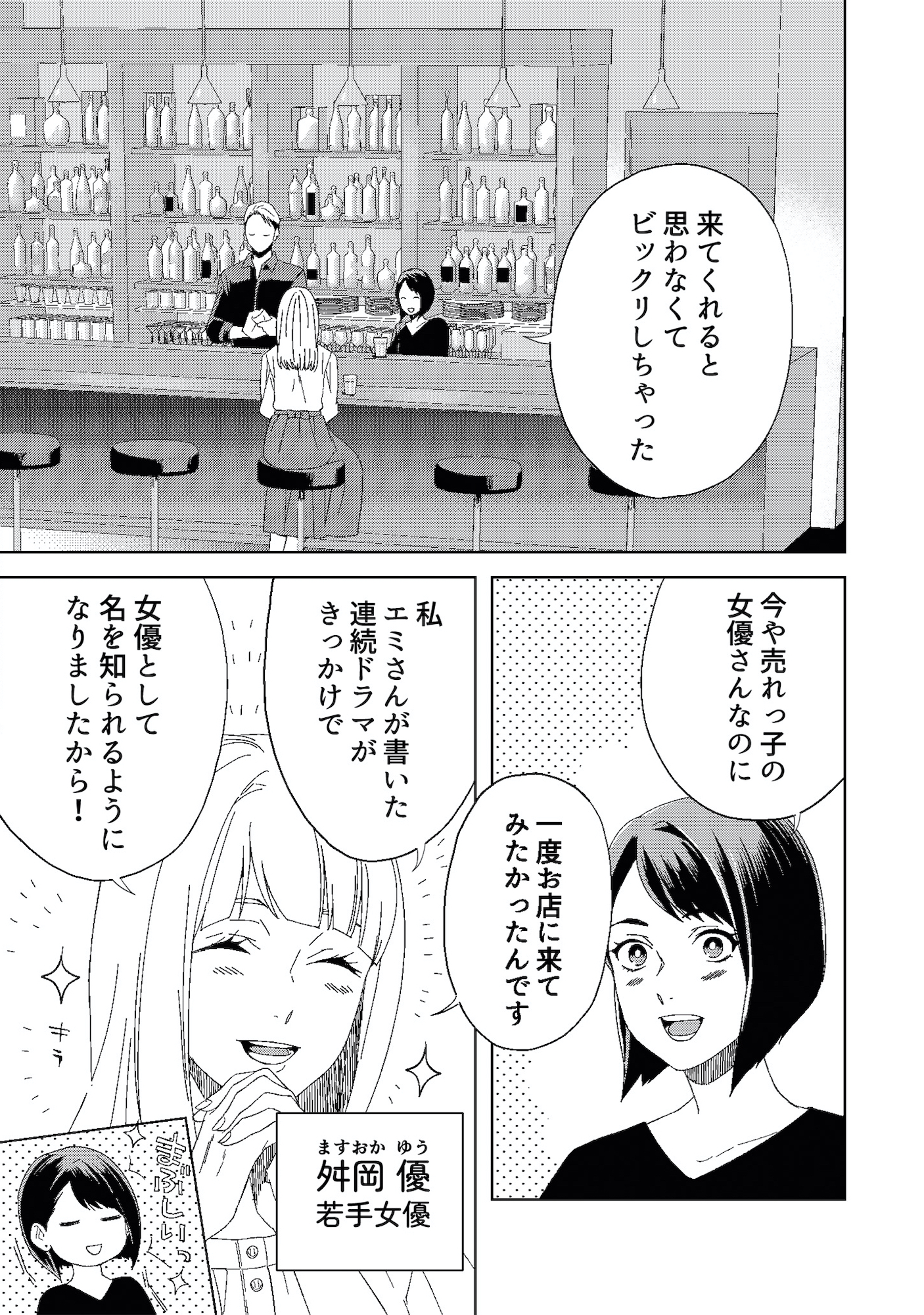バーを営む霊感ゼロの脚本家・エミ(35歳)。ホラー系連載の締め切りを目前にした彼女は、1杯のタダ酒と引き換えに怪談の“ネタ”を求めていた。