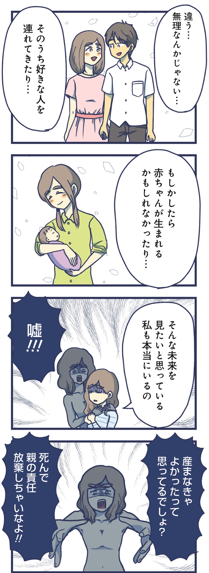 2人目を出産後、甘えてくるようになった4歳の長女。そんなある日、長女が自慰行為にふけっている現場を見てしまい、主人公は大きな衝撃を受けます。ネットで調べても「よくあること」「見守ってあげましょう」という言説ばかりで、母親の葛藤に寄り添うようなものは見当たりません。「娘が気持ち悪い」そう思ってしまう自分に苦しむ日々のなかで、徐々に追い詰められて……。