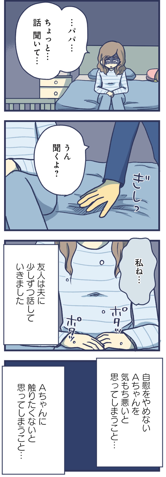 2人目を出産後、甘えてくるようになった4歳の長女。そんなある日、長女が自慰行為にふけっている現場を見てしまい、主人公は大きな衝撃を受けます。ネットで調べても「よくあること」「見守ってあげましょう」という言説ばかりで、母親の葛藤に寄り添うようなものは見当たりません。「娘が気持ち悪い」そう思ってしまう自分に苦しむ日々のなかで、徐々に追い詰められて……。今回は、幼すぎる性の目覚めに葛藤する母娘の苦しみを鮮烈に描いたコミックエッセイを特別抜粋でお届けします。