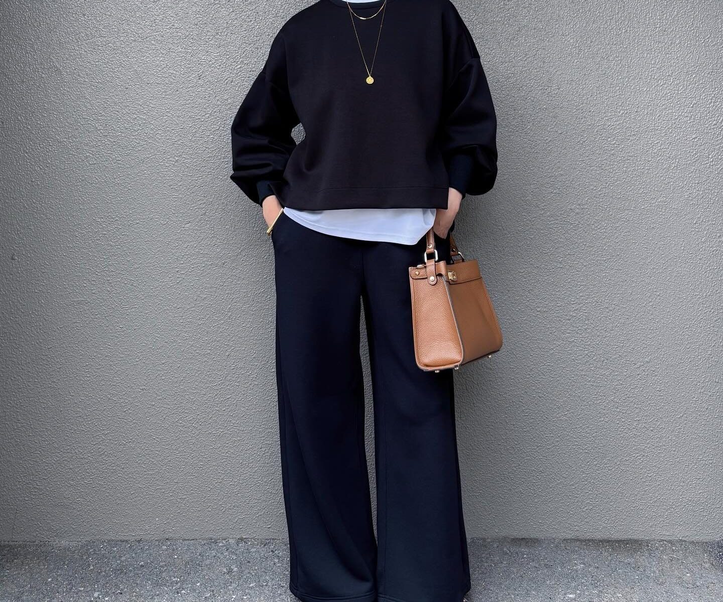 全体をダークトーンで統一することで、カジュアルなスウェットも大人っぽい印象にまとまっています。特に、パフスウェットバギーパンツは、きれいめなデザインが魅力。また、インナーに白のシャツをレイヤードし、裾からちら見せすることで、着こなしに奥行きと軽さが加わっています。レオパード柄のパンプスや、キャメルのバッグなど、小物でメリハリをつけているのもさすがのテクニックです。