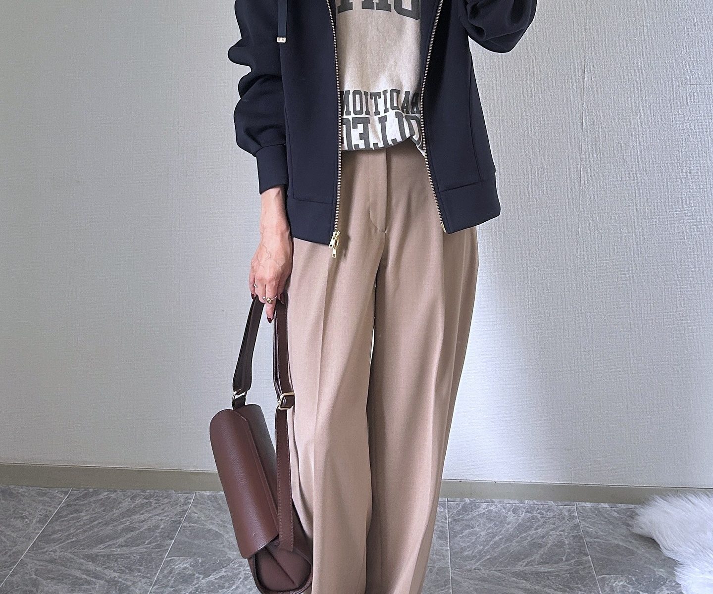 インナーにはロゴTシャツ、ボトムスにはやわらかな素材のワイドパンツを合わせ、全体を落ち着いたトーンでまとめています。特に、ネイビーとベージュの配色が、品のいいリラックス感を演出。足元とバッグを濃いブラウンで統一し、全体を引き締めることで、大人のかわいらしさと洗練さを両立した着こなしとなっています。