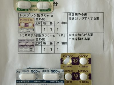というわけで、解熱のカロナールに加えて、比較的新しい咳止めのレスプレン、オーソドックスなトラネキサム酸という布陣でコロナに挑むことになりました。過去咳止めといえばムコダインが出ていた記憶があり、レスプレンは初めて飲みます。