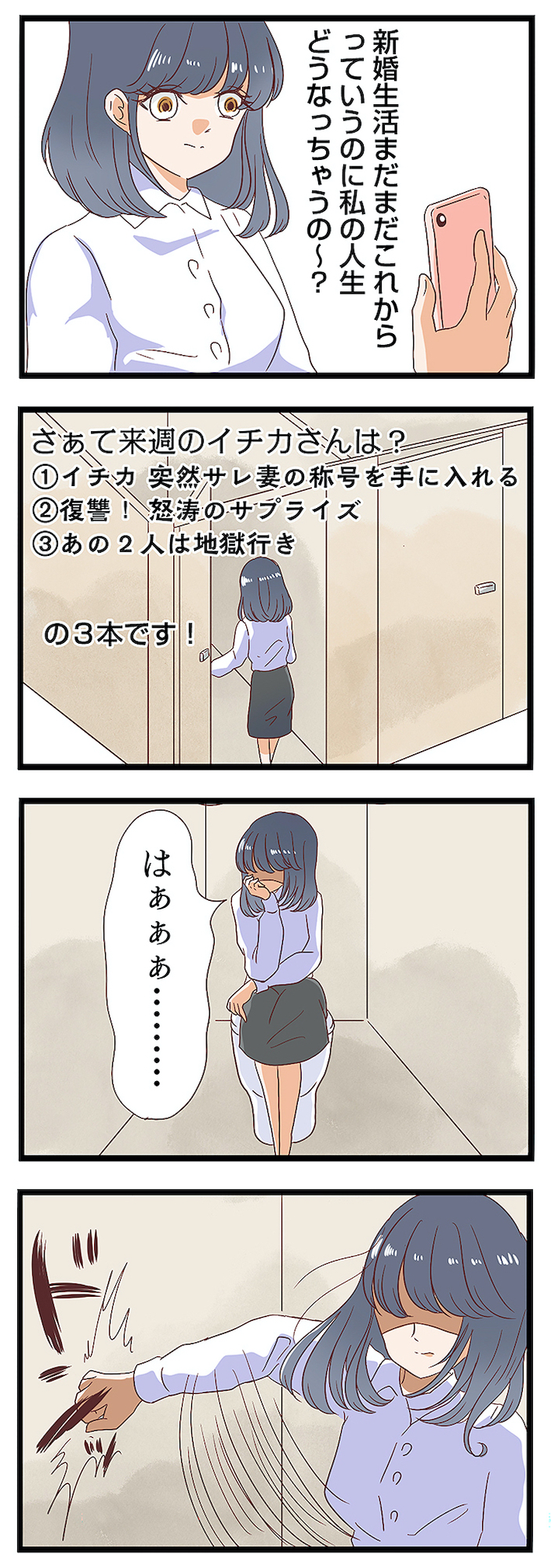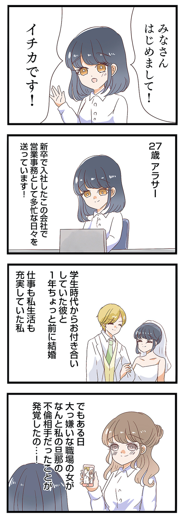 旦那の不倫相手は大嫌いな職場の後輩!「サレ妻」の称号を手に入れた妻の復讐劇とは?【同僚が私の夫と結婚するらしいので、最高の仕返しを贈ります #1】 2025.11.08 LOVE 不倫マンガマンガ試し読み試し読み同僚が私の夫と結婚するらしいので、最高の仕返しを贈ります 試し読み 学生時代から7年交際していたリュウタと結婚したイチカ。 仕事も私生活も充実した日々を送っていたが、ある日夫の不倫が発覚! しかも、旦那の不倫相手はイチカが大嫌いな職場の後輩・ナナだったことが判明する。 リュウタの妻の正体を知らずに、恋愛相談をするナナ。イチカは味方を装って証拠を集め、徹底的に2人を追い詰めるようとするが…。 ※本記事はしろみ著の電子書籍『同僚が私の夫と結婚するらしいので、最高の仕返しを贈ります』から一部抜粋・編集しました。 ▶Renta!『同僚が私の夫と結婚するらしいので、最高の仕返しを贈ります』 ▶30日間無料▶ Amazonの読み放題をチェック! 【99円で2カ月間】 Audible が無制限で聴ける! ▶楽天KOBO 初回購入金額のポイント最大70倍! スポンサーリンク 続きを読む 次のページへ >> 1 2 3 【注目の記事】 1番対策が難しかった…!頬のたるみやほうれい線につながるNG食事習慣最後のひとつ 冬の寒さに負けない!そろそろ準備したい中綿アウター×【ユニクロ】バズりデニムの着こなし【40代の毎日コーデ】 【ユニクロ】カシミヤタッチニットで魅せる!旬のブラウンを効かせた洗練肩掛けテク【40代の毎日コーデ】 東大生が注意喚起!「鵜呑みにしてはいけない」SNSで「でたらめの受験情報」を発信する人の特徴とは 「東大受験が簡単!?」な難関私立高出身者。天才たちの受験勉強、その驚きの実態とは この記事は OTONA SALONE1 スポンサーリンク スポンサーリンク 【人気の関連記事】 ハマったら危険!不倫上手な男たちが絶対にしない8つのこと 2016年も残すところあと少しですが、今年はとにかく芸能人の不倫ネタが多かった印象。どうして女性は、傷つくのがわかっているのに不倫に走ってしまうのか。大人の女性たち… 【なぜどく#7 45歳・A子さん編】地方は独身男が少ない!40代でやっと気づいたこと 【なぜ彼女は独身なのか?40代独女の本音 ♯7】アラフォー独身のイラストレーターNobbyさんが、絶賛婚活中の編集長・アサミといっしょに、婚活中の独身女性と「私たちはな… 【なぜどく#8】42歳独女が月額10万のセレブ婚活サロンに登録した結果… 【なぜ彼女は独身なの?40代独女の本音 ♯8】アラフォー独身のイラストレーターNobbyさんが、絶賛婚活中の編集長・アサミといっしょに、婚活中の独身女性と「私たちはなぜ…