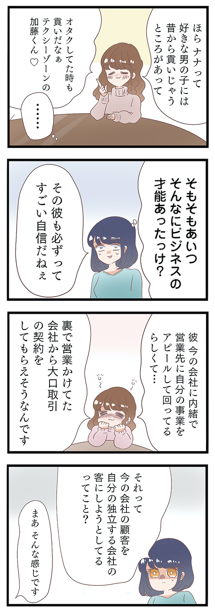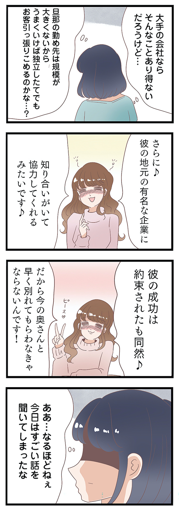 「いいもの録音させていただきました」不倫相手から聞き出した、旦那が考える独立後の“策略”とは?【同僚が私の夫と結婚するらしいので、最高の仕返しを贈ります #12】 2025.11.13 LOVE 不倫試し読みマンガ同僚が私の夫と結婚するらしいので、最高の仕返しを贈ります 試し読みマンガ試し読み 学生時代から7年交際していたリュウタと結婚したイチカ。 仕事も私生活も充実した日々を送っていたが、ある日夫の不倫が発覚! しかも、旦那の不倫相手はイチカが大嫌いな職場の後輩・ナナだったことが判明する。 リュウタの妻の正体を知らずに、恋愛相談をするナナ。イチカは味方を装って証拠を集め、徹底的に2人を追い詰めるようとするが…。 ※本記事はしろみ著の電子書籍『同僚が私の夫と結婚するらしいので、最高の仕返しを贈ります』から一部抜粋・編集しました。 ▶Renta!『同僚が私の夫と結婚するらしいので、最高の仕返しを贈ります』 ▶30日間無料▶ Amazonの読み放題をチェック! 【99円で2カ月間】 Audible が無制限で聴ける! ▶楽天KOBO 初回購入金額のポイント最大70倍! スポンサーリンク 続きを読む 次のページへ >> 1 2 3 【注目の記事】 1番対策が難しかった…!頬のたるみやほうれい線につながるNG食事習慣最後のひとつ 冬の寒さに負けない!そろそろ準備したい中綿アウター×【ユニクロ】バズりデニムの着こなし【40代の毎日コーデ】 【ユニクロ】カシミヤタッチニットで魅せる!旬のブラウンを効かせた洗練肩掛けテク【40代の毎日コーデ】 東大生が注意喚起!「鵜呑みにしてはいけない」SNSで「でたらめの受験情報」を発信する人の特徴とは 「東大受験が簡単!?」な難関私立高出身者。天才たちの受験勉強、その驚きの実態とは この記事は OTONA SALONE1 スポンサーリンク スポンサーリンク 【人気の関連記事】 ハマったら危険!不倫上手な男たちが絶対にしない8つのこと 2016年も残すところあと少しですが、今年はとにかく芸能人の不倫ネタが多かった印象。どうして女性は、傷つくのがわかっているのに不倫に走ってしまうのか。大人の女性たち… 【なぜどく#7 45歳・A子さん編】地方は独身男が少ない!40代でやっと気づいたこと 【なぜ彼女は独身なのか?40代独女の本音 ♯7】アラフォー独身のイラストレーターNobbyさんが、絶賛婚活中の編集長・アサミといっしょに、婚活中の独身女性と「私たちはな… 【なぜどく#8】42歳独女が月額10万のセレブ婚活サロンに登録した結果… 【なぜ彼女は独身なの?40代独女の本音 ♯8】アラフォー独身のイラストレーターNobbyさんが、絶賛婚活中の編集長・アサミといっしょに、婚活中の独身女性と「私たちはなぜ…
