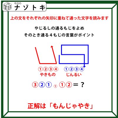 あとは問題文の文字を数字順に読んでいきましょう。正解は「もんじゃやき」でした。