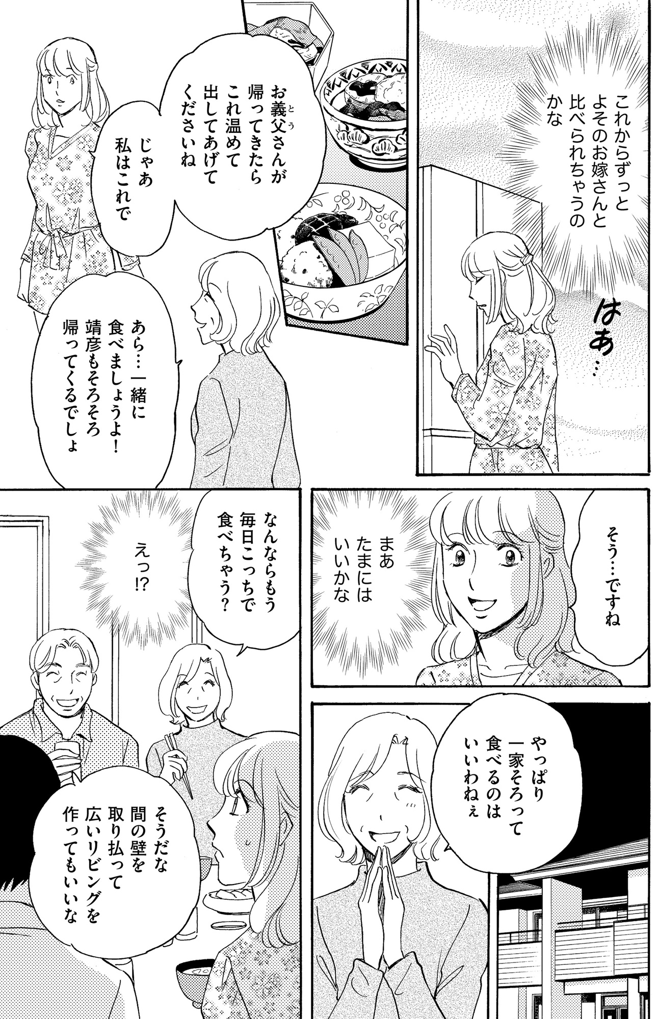 他のお嫁さんと比べられるのはイヤ!義両親宅のごはんを作り、一緒に食卓を囲むように【ぼっち主婦、ハブられたくないから #21】 2025.11.09 LIFE マンガぼっち主婦、ハブられたくないから60万のコート買う 試し読み試し読みマンガ試し読み 人付き合いが苦手でなかなかママ友ができずにいた芳乃。 そんなある日、公園で出会った沙織と意気投合! 初めてできたママ友に浮かれる芳乃だったが、社交的な沙織にはほかにもたくさんのママ友がいて……!? 読者の本当にあったママ友・身内間のトラブルをコミカライズする傑作選!! ※本記事は伊東爾子著の電子書籍『ぼっち主婦、ハブられたくないから60万のコート買う』から一部抜粋・編集しました。 ▶ebookjapan『ぼっち主婦、ハブられたくないから60万のコート買う』 ▶30日間無料▶ Amazonの読み放題をチェック! 【99円で2カ月間】 Audible が無制限で聴ける! ▶楽天KOBO 初回購入金額のポイント最大70倍! スポンサーリンク 続きを読む 次のページへ >> 1 2 3 【注目の記事】 1番対策が難しかった…!頬のたるみやほうれい線につながるNG食事習慣最後のひとつ 冬の寒さに負けない!そろそろ準備したい中綿アウター×【ユニクロ】バズりデニムの着こなし【40代の毎日コーデ】 【ユニクロ】カシミヤタッチニットで魅せる!旬のブラウンを効かせた洗練肩掛けテク【40代の毎日コーデ】 東大生が注意喚起!「鵜呑みにしてはいけない」SNSで「でたらめの受験情報」を発信する人の特徴とは 「東大受験が簡単!?」な難関私立高出身者。天才たちの受験勉強、その驚きの実態とは この記事は OTONA SALONE1 スポンサーリンク スポンサーリンク 【人気の関連記事】 40代。もう私、いつ死んだっていい気がするけど | あした死ぬには、#1 突然の病気。更年期障害。取れない疲労、お金の不安、これからの人生の迷い……。40代がぶち当たる「壁」をあまりにもリアルに描き出し、熱く静かな共感をさらった雁須磨子さ… 人前では「完璧な夫婦」を演じる夫。普段は私を無視してるって、誰も知らない【女40代はおそろしい#11】 40歳・フリーデザイナーの丸山ふさ子。 夫との攻防戦の末、「共働きだけど夫のほうが家事育児多め」という関係にやっとたどり着く。バリキャリ会社員のまい、起業家のかお… 年齢、たまに忘れてない?アラフォーあるあるが「共感しかない」と話題 「最近、若い頃と比べて何かが違う……」そんなモヤモヤを抱えているアラフォーのみなさん、必見!イラストレーターのRingoman(@ringo_fashion)さんがインスタグラムに投稿…