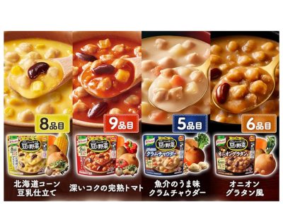 ゴロゴロの具入り! 電子レンジでそのままチンできるレトルトタイプで、3種類食べ比べできます。豆たっぷりだから食物繊維も豊富♪ たんぱく質量は商品によって異なり、5.1~7.1g