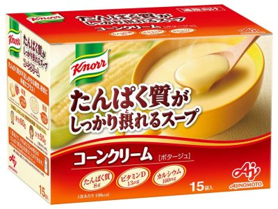 クノールの粉末スープシリーズで「コーンクリーム」味もあり。このスープを添えるだけで、たんぱく質8gもプラスできるとは! コスパも抜群