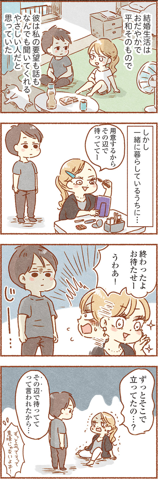 夫が心の底から笑った顔を見たことがない…結婚生活の中で感じた‟謎の違和感“【夫と心が通わない #1】 2025.11.27 LOVE 発達障害家族関係マンガ試し読みマンガ夫と心が通わない カサンドラ症候群で笑えなくなった私が離婚するまでの話 試し読み試し読み夫婦関係離婚 長い結婚生活の中、夫が心の底から笑ったことはあったのだろうか? 結婚してから夫に感じていた謎の違和感。 夫と会話がすれ違うたびに、妻は「全て私が悪い」と思い込み、心身ともにボロボロになってゆく…。 「カサンドラ症候群」に苦しむひとりの女性が、悩み、もがき、たどり着いた、本当の自分を取り戻すための道とは――。 ※本記事は鳥頭ゆば著、アゴ山原案の書籍『夫と心が通わない カサンドラ症候群で笑えなくなった私が離婚するまでの話』から一部抜粋・編集しました。 ▶Renta『夫と心が通わない カサンドラ症候群で笑えなくなった私が離婚するまでの話』 ▶30日間無料▶ Amazonの読み放題をチェック! 【99円で2カ月間】 Audible が無制限で聴ける! ▶楽天KOBO 初回購入金額のポイント最大70倍! スポンサーリンク 続きを読む 次のページへ >> 1 2 3 4 【注目の記事】 1番対策が難しかった…!頬のたるみやほうれい線につながるNG食事習慣最後のひとつ 冬の寒さに負けない!そろそろ準備したい中綿アウター×【ユニクロ】バズりデニムの着こなし【40代の毎日コーデ】 【ユニクロ】カシミヤタッチニットで魅せる!旬のブラウンを効かせた洗練肩掛けテク【40代の毎日コーデ】 東大生が注意喚起!「鵜呑みにしてはいけない」SNSで「でたらめの受験情報」を発信する人の特徴とは 「東大受験が簡単!?」な難関私立高出身者。天才たちの受験勉強、その驚きの実態とは この記事は OTONA SALONE1 スポンサーリンク スポンサーリンク 【人気の関連記事】 【なぜどく#7 45歳・A子さん編】地方は独身男が少ない!40代でやっと気づいたこと 【なぜ彼女は独身なのか?40代独女の本音 ♯7】アラフォー独身のイラストレーターNobbyさんが、絶賛婚活中の編集長・アサミといっしょに、婚活中の独身女性と「私たちはな… 【なぜどく#8】42歳独女が月額10万のセレブ婚活サロンに登録した結果… 【なぜ彼女は独身なの?40代独女の本音 ♯8】アラフォー独身のイラストレーターNobbyさんが、絶賛婚活中の編集長・アサミといっしょに、婚活中の独身女性と「私たちはなぜ… 【なぜどく#13 45歳・ヨーコさん編】バリキャリ女子は、婚活に迷走する? アラフォー独身のイラストレーターNobbyさんが、絶賛婚活中の編集長・アサミといっしょに、婚活中の独身女性と「私たちはなぜ婚活し続けるのか」まったり語り合う会のレポ…