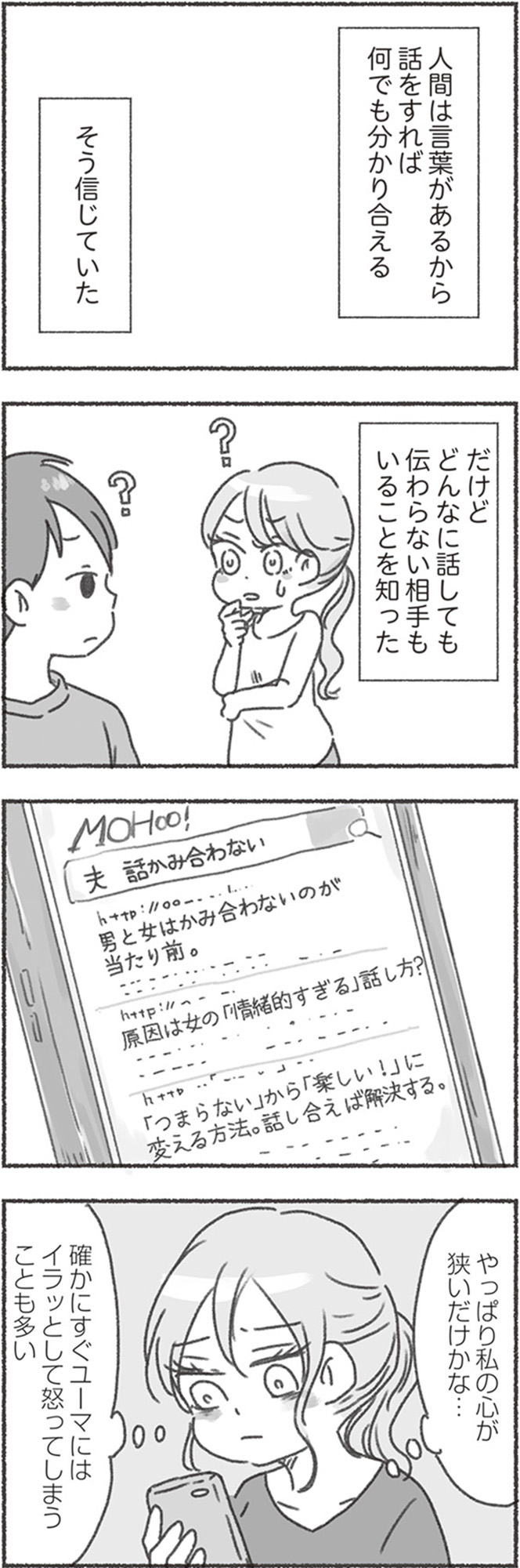私の心が狭いだけ? 話が噛み合わずすぐ夫を怒ってしまう。そんな中、娘にある異変が…【夫と心が通わない #10】 2025.12.01 LOVE マンガ試し読み試し読み発達障害家族関係マンガ離婚夫婦関係夫と心が通わない カサンドラ症候群で笑えなくなった私が離婚するまでの話 試し読み 長い結婚生活の中、夫が心の底から笑ったことはあったのだろうか? 結婚してから夫に感じていた謎の違和感。 夫と会話がすれ違うたびに、妻は「全て私が悪い」と思い込み、心身ともにボロボロになってゆく…。 「カサンドラ症候群」に苦しむひとりの女性が、悩み、もがき、たどり着いた、本当の自分を取り戻すための道とは――。 ※本記事は鳥頭ゆば著、アゴ山原案の書籍『夫と心が通わない カサンドラ症候群で笑えなくなった私が離婚するまでの話』から一部抜粋・編集しました。 話せば伝わる? ▶Renta『夫と心が通わない カサンドラ症候群で笑えなくなった私が離婚するまでの話』 ▶30日間無料▶ Amazonの読み放題をチェック! 【99円で2カ月間】 Audible が無制限で聴ける! ▶楽天KOBO 初回購入金額のポイント最大70倍! スポンサーリンク 続きを読む 次のページへ >> 1 2 3 4 5 【注目の記事】 1番対策が難しかった…!頬のたるみやほうれい線につながるNG食事習慣最後のひとつ 冬の寒さに負けない!そろそろ準備したい中綿アウター×【ユニクロ】バズりデニムの着こなし【40代の毎日コーデ】 【ユニクロ】カシミヤタッチニットで魅せる!旬のブラウンを効かせた洗練肩掛けテク【40代の毎日コーデ】 東大生が注意喚起!「鵜呑みにしてはいけない」SNSで「でたらめの受験情報」を発信する人の特徴とは 「東大受験が簡単!?」な難関私立高出身者。天才たちの受験勉強、その驚きの実態とは この記事は OTONA SALONE1 スポンサーリンク スポンサーリンク 【人気の関連記事】 【なぜどく#7 45歳・A子さん編】地方は独身男が少ない!40代でやっと気づいたこと 【なぜ彼女は独身なのか?40代独女の本音 ♯7】アラフォー独身のイラストレーターNobbyさんが、絶賛婚活中の編集長・アサミといっしょに、婚活中の独身女性と「私たちはな… 【なぜどく#8】42歳独女が月額10万のセレブ婚活サロンに登録した結果… 【なぜ彼女は独身なの?40代独女の本音 ♯8】アラフォー独身のイラストレーターNobbyさんが、絶賛婚活中の編集長・アサミといっしょに、婚活中の独身女性と「私たちはなぜ… 【なぜどく#13 45歳・ヨーコさん編】バリキャリ女子は、婚活に迷走する? アラフォー独身のイラストレーターNobbyさんが、絶賛婚活中の編集長・アサミといっしょに、婚活中の独身女性と「私たちはなぜ婚活し続けるのか」まったり語り合う会のレポ…
