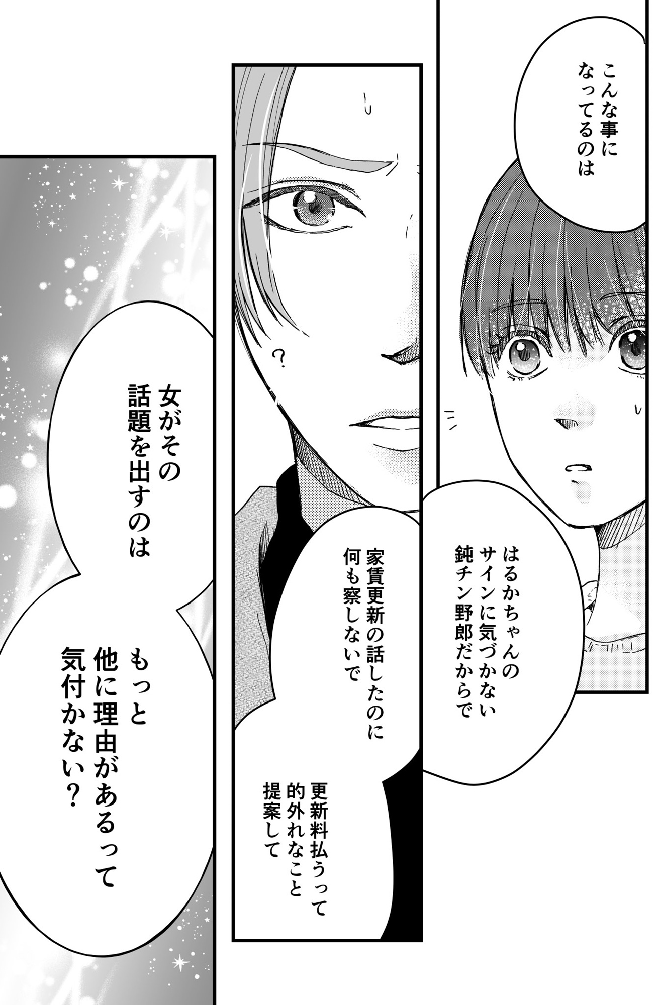 「彼女からのサイン」に気付かない男に、文句を言われる筋合いはない【結婚したい私と、彼氏じゃない人との二人暮らし。 #11】 2025.12.02 LOVE 試し読み結婚したい私と、彼氏じゃない人との二人暮らし。 試し読みマンガ 美容師のはるか(33)は、付き合って3年経つ彼氏の浩介(30)に、『結婚したい!』をはじめ、些細なことも口に出さずに言えない、モヤモヤを抱える日々を送っていた。 そんな中、彼氏と別れて引っ越し先を探す、オネエ系?なお客さんの優希(33)とひょんなことから、新生活が始まり……!? ※本記事は原作:NARATA 作画:ゆいじの電子書籍『結婚したい私と、彼氏じゃない人との二人暮らし。』から一部抜粋・編集しました。 ▶ebookjapan『結婚したい私と、彼氏じゃない人との二人暮らし。』 ▶LINEマンガ『結婚したい私と、彼氏じゃない人との二人暮らし。』 ▶30日間無料▶ Amazonの読み放題をチェック! 【99円で2カ月間】 Audible が無制限で聴ける! ▶楽天KOBO 初回購入金額のポイント最大70倍! スポンサーリンク 続きを読む 次のページへ >> 1 2 3 【注目の記事】 1番対策が難しかった…!頬のたるみやほうれい線につながるNG食事習慣最後のひとつ 冬の寒さに負けない!そろそろ準備したい中綿アウター×【ユニクロ】バズりデニムの着こなし【40代の毎日コーデ】 【ユニクロ】カシミヤタッチニットで魅せる!旬のブラウンを効かせた洗練肩掛けテク【40代の毎日コーデ】 東大生が注意喚起!「鵜呑みにしてはいけない」SNSで「でたらめの受験情報」を発信する人の特徴とは 「東大受験が簡単!?」な難関私立高出身者。天才たちの受験勉強、その驚きの実態とは この記事は OTONA SALONE1 スポンサーリンク スポンサーリンク 【人気の関連記事】 【なぜどく#7 45歳・A子さん編】地方は独身男が少ない!40代でやっと気づいたこと 【なぜ彼女は独身なのか?40代独女の本音 ♯7】アラフォー独身のイラストレーターNobbyさんが、絶賛婚活中の編集長・アサミといっしょに、婚活中の独身女性と「私たちはな… 【なぜどく#8】42歳独女が月額10万のセレブ婚活サロンに登録した結果… 【なぜ彼女は独身なの?40代独女の本音 ♯8】アラフォー独身のイラストレーターNobbyさんが、絶賛婚活中の編集長・アサミといっしょに、婚活中の独身女性と「私たちはなぜ… 【なぜどく#13 45歳・ヨーコさん編】バリキャリ女子は、婚活に迷走する? アラフォー独身のイラストレーターNobbyさんが、絶賛婚活中の編集長・アサミといっしょに、婚活中の独身女性と「私たちはなぜ婚活し続けるのか」まったり語り合う会のレポ…