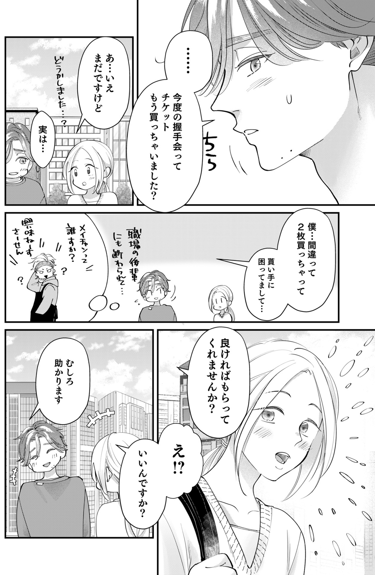 おしゃれイケメンに、推しの握手会に誘われた!連絡先を交換しちゃった【君の推しみたいになれないけれど #6】 2025.11.29 LOVE マンガ試し読み試し読みマンガ君の推しみたいになれないけれど 試し読み ▶ebookjapan『君の推しみたいになれないけれど』 ▶LINEマンガ『君の推しみたいになれないけれど』 ▶30日間無料▶ Amazonの読み放題をチェック! 【99円で2カ月間】 Audible が無制限で聴ける! ▶楽天KOBO 初回購入金額のポイント最大70倍! スポンサーリンク 次のページへ >> 1 2 3 【注目の記事】 1番対策が難しかった…!頬のたるみやほうれい線につながるNG食事習慣最後のひとつ 冬の寒さに負けない!そろそろ準備したい中綿アウター×【ユニクロ】バズりデニムの着こなし【40代の毎日コーデ】 【ユニクロ】カシミヤタッチニットで魅せる!旬のブラウンを効かせた洗練肩掛けテク【40代の毎日コーデ】 東大生が注意喚起!「鵜呑みにしてはいけない」SNSで「でたらめの受験情報」を発信する人の特徴とは 「東大受験が簡単!?」な難関私立高出身者。天才たちの受験勉強、その驚きの実態とは この記事は OTONA SALONE1 スポンサーリンク スポンサーリンク 【人気の関連記事】 【なぜどく#7 45歳・A子さん編】地方は独身男が少ない!40代でやっと気づいたこと 【なぜ彼女は独身なのか?40代独女の本音 ♯7】アラフォー独身のイラストレーターNobbyさんが、絶賛婚活中の編集長・アサミといっしょに、婚活中の独身女性と「私たちはな… 【なぜどく#8】42歳独女が月額10万のセレブ婚活サロンに登録した結果… 【なぜ彼女は独身なの?40代独女の本音 ♯8】アラフォー独身のイラストレーターNobbyさんが、絶賛婚活中の編集長・アサミといっしょに、婚活中の独身女性と「私たちはなぜ… 【なぜどく#13 45歳・ヨーコさん編】バリキャリ女子は、婚活に迷走する? アラフォー独身のイラストレーターNobbyさんが、絶賛婚活中の編集長・アサミといっしょに、婚活中の独身女性と「私たちはなぜ婚活し続けるのか」まったり語り合う会のレポ…