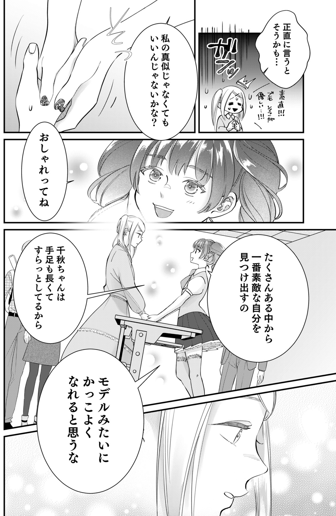 「おしゃれは一番素敵な自分を見つけ出すんだよ」推しが教えてくれたこと【君の推しみたいになれないけれど #8】 2025.11.30 LOVE マンガ試し読み試し読みマンガ君の推しみたいになれないけれど 試し読み ▶ebookjapan『君の推しみたいになれないけれど』 ▶LINEマンガ『君の推しみたいになれないけれど』 ▶30日間無料▶ Amazonの読み放題をチェック! 【99円で2カ月間】 Audible が無制限で聴ける! ▶楽天KOBO 初回購入金額のポイント最大70倍! スポンサーリンク 次のページへ >> 1 2 3 【注目の記事】 1番対策が難しかった…!頬のたるみやほうれい線につながるNG食事習慣最後のひとつ 冬の寒さに負けない!そろそろ準備したい中綿アウター×【ユニクロ】バズりデニムの着こなし【40代の毎日コーデ】 【ユニクロ】カシミヤタッチニットで魅せる!旬のブラウンを効かせた洗練肩掛けテク【40代の毎日コーデ】 東大生が注意喚起!「鵜呑みにしてはいけない」SNSで「でたらめの受験情報」を発信する人の特徴とは 「東大受験が簡単!?」な難関私立高出身者。天才たちの受験勉強、その驚きの実態とは この記事は OTONA SALONE1 スポンサーリンク スポンサーリンク 【人気の関連記事】 【なぜどく#7 45歳・A子さん編】地方は独身男が少ない!40代でやっと気づいたこと 【なぜ彼女は独身なのか?40代独女の本音 ♯7】アラフォー独身のイラストレーターNobbyさんが、絶賛婚活中の編集長・アサミといっしょに、婚活中の独身女性と「私たちはな… 【なぜどく#8】42歳独女が月額10万のセレブ婚活サロンに登録した結果… 【なぜ彼女は独身なの?40代独女の本音 ♯8】アラフォー独身のイラストレーターNobbyさんが、絶賛婚活中の編集長・アサミといっしょに、婚活中の独身女性と「私たちはなぜ… 【なぜどく#13 45歳・ヨーコさん編】バリキャリ女子は、婚活に迷走する? アラフォー独身のイラストレーターNobbyさんが、絶賛婚活中の編集長・アサミといっしょに、婚活中の独身女性と「私たちはなぜ婚活し続けるのか」まったり語り合う会のレポ…