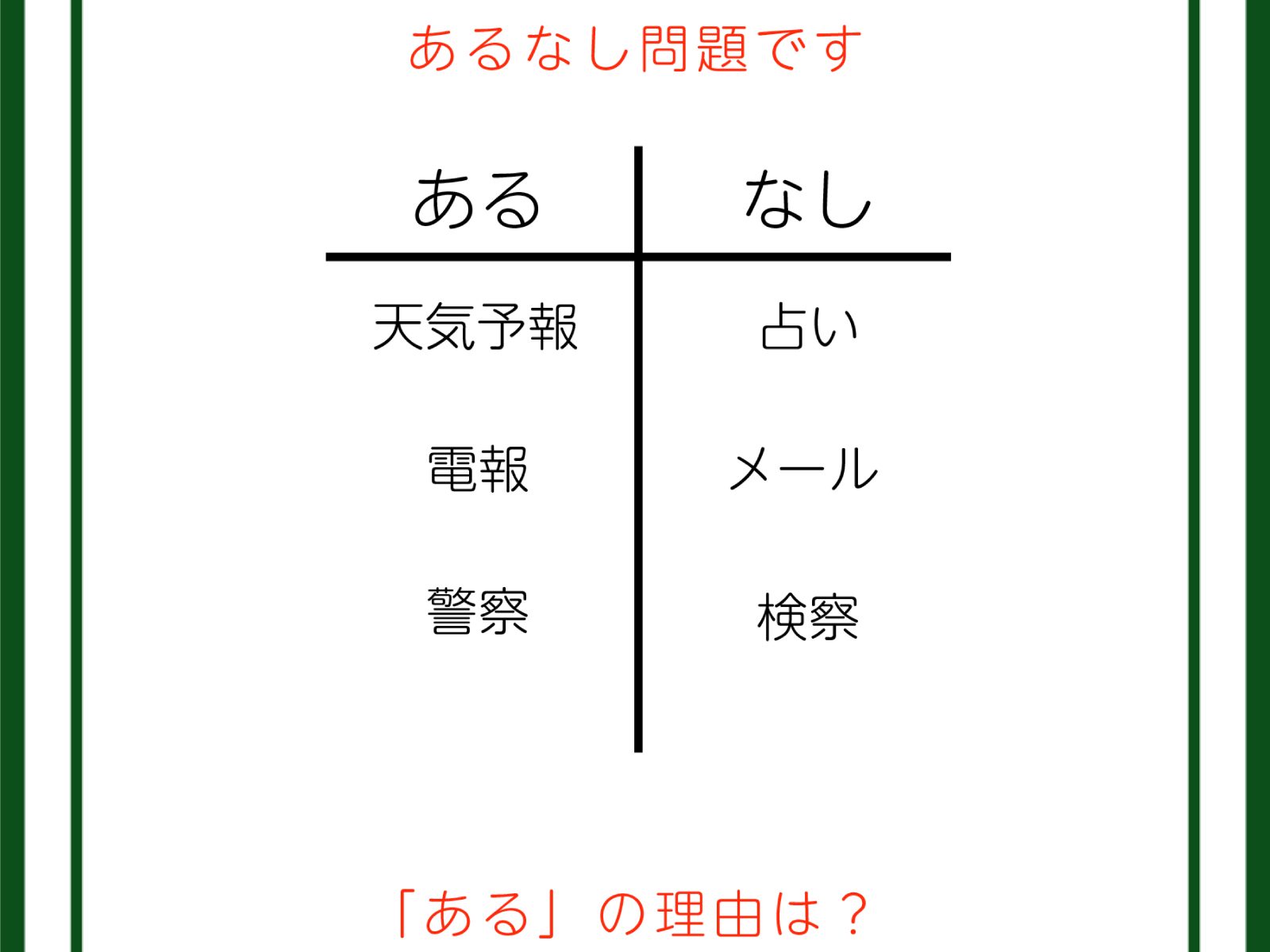 あるなしクイズです!「天気予報にあって占いにない。警察にあって検察にない」あるには、覚えておきたいものがありますね【難易度LV3.・中辛】