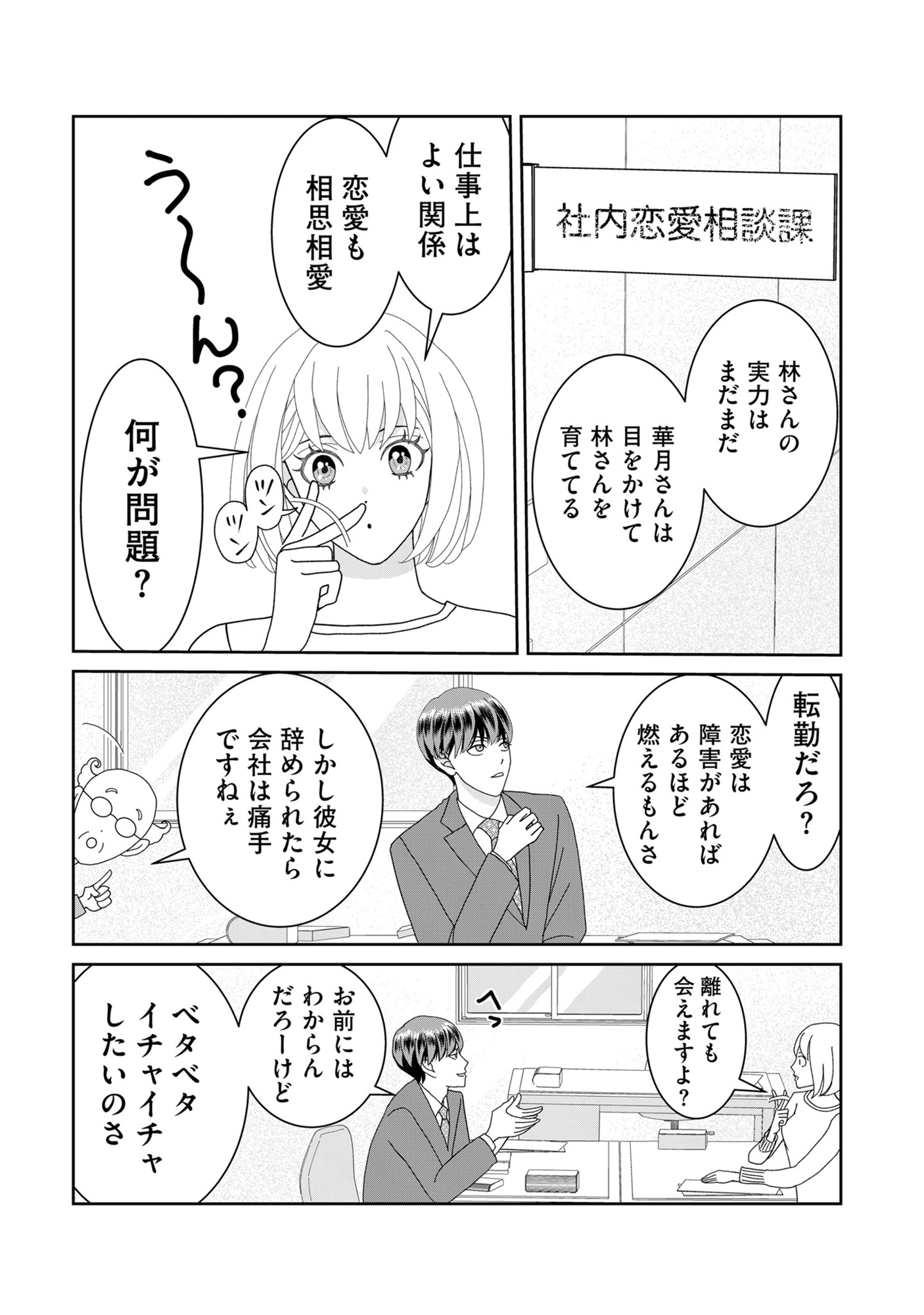18歳差でも、上司と部下の関係でも相思相愛なのに…2人のあいだに起こっている問題とは【小糸さんに恋はわからない #12】 2025.12.03 LOVE マンガ試し読み試し読み小糸さんに恋はわからない 試し読みマンガ 社内恋愛が生むトラブルによる、人材損失を防ぐために新しくできた社内恋愛相談課。 そこに異動してきた空気が読めない女子、太巻小糸とパワハラで飛ばされた小原。恋愛にまったく興味のない小糸と、早く元の仕事に戻りたい小原の凸凹コンビが、社内の恋バナをバッサリ解決!? 不倫、セクハラ、同性愛、上司と部下の恋の相談まで。複雑になった恋の問題に、恋愛力ゼロの小糸が素朴な疑問を投げかける社内恋愛ヒューマンドラマ! ※本記事は松本小夢著の電子書籍『小糸さんに恋はわからない』から一部抜粋・編集しました。 ▶ebookjapan『小糸さんに恋はわからない』 ▶LINEマンガ『小糸さんに恋はわからない』 ▶30日間無料▶ Amazonの読み放題をチェック! 【99円で2カ月間】 Audible が無制限で聴ける! ▶楽天KOBO 初回購入金額のポイント最大70倍! スポンサーリンク 続きを読む 次のページへ >> 1 2 3 【注目の記事】 1番対策が難しかった…!頬のたるみやほうれい線につながるNG食事習慣最後のひとつ 冬の寒さに負けない!そろそろ準備したい中綿アウター×【ユニクロ】バズりデニムの着こなし【40代の毎日コーデ】 【ユニクロ】カシミヤタッチニットで魅せる!旬のブラウンを効かせた洗練肩掛けテク【40代の毎日コーデ】 東大生が注意喚起!「鵜呑みにしてはいけない」SNSで「でたらめの受験情報」を発信する人の特徴とは 「東大受験が簡単!?」な難関私立高出身者。天才たちの受験勉強、その驚きの実態とは この記事は OTONA SALONE1 スポンサーリンク スポンサーリンク 【人気の関連記事】 【なぜどく#7 45歳・A子さん編】地方は独身男が少ない!40代でやっと気づいたこと 【なぜ彼女は独身なのか?40代独女の本音 ♯7】アラフォー独身のイラストレーターNobbyさんが、絶賛婚活中の編集長・アサミといっしょに、婚活中の独身女性と「私たちはな… 【なぜどく#8】42歳独女が月額10万のセレブ婚活サロンに登録した結果… 【なぜ彼女は独身なの?40代独女の本音 ♯8】アラフォー独身のイラストレーターNobbyさんが、絶賛婚活中の編集長・アサミといっしょに、婚活中の独身女性と「私たちはなぜ… 【なぜどく#13 45歳・ヨーコさん編】バリキャリ女子は、婚活に迷走する? アラフォー独身のイラストレーターNobbyさんが、絶賛婚活中の編集長・アサミといっしょに、婚活中の独身女性と「私たちはなぜ婚活し続けるのか」まったり語り合う会のレポ…