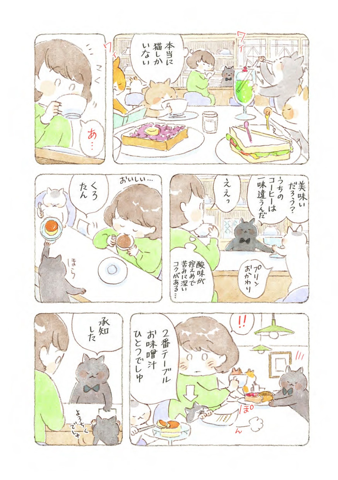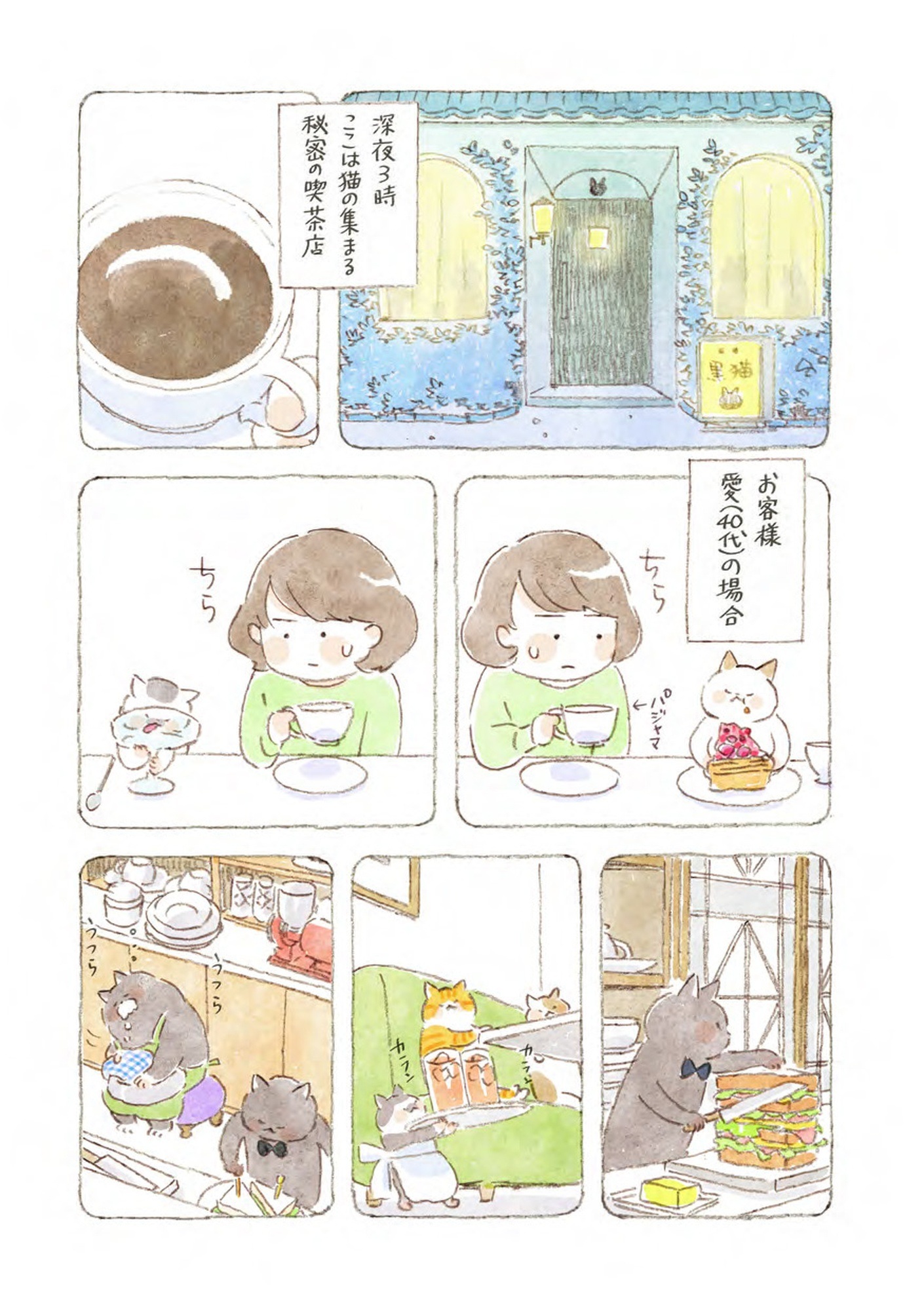 真夜中に猫が集まる喫茶店に迷い込む悩める人間たちが、猫たちとおいしいメニューに癒されるストーリー。